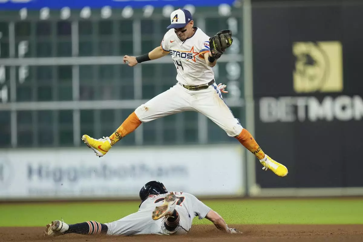 Houston Astros second baseman Mauricio Dubón (14) leaps to catch the throw as Detroit Tigers' Trey Sweeney steals second base during the seventh inning of a baseball game Monday, April 28, 2025, in Houston. (AP Photo/David J. Phillip)
