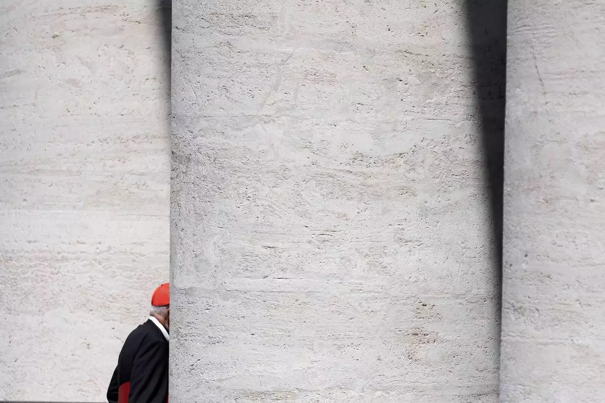 An unidentified Cardinal walks through the St. Peter's Square colonnade at the end of a college of cardinals' meeting, at the Vatican, Tuesday, April 29, 2025. (AP Photo/Gregorio Borgia)