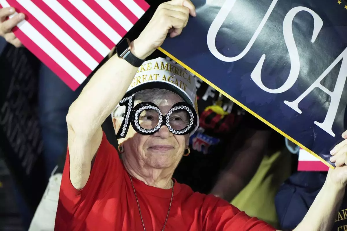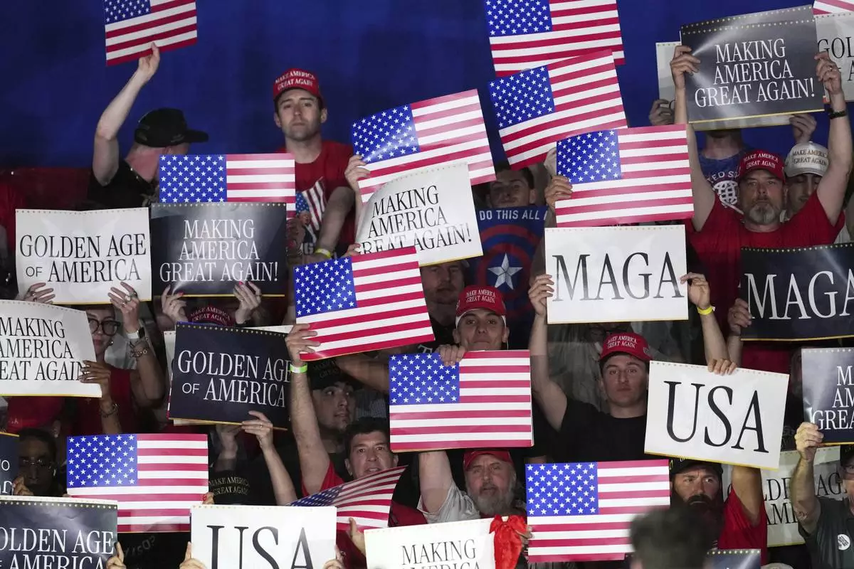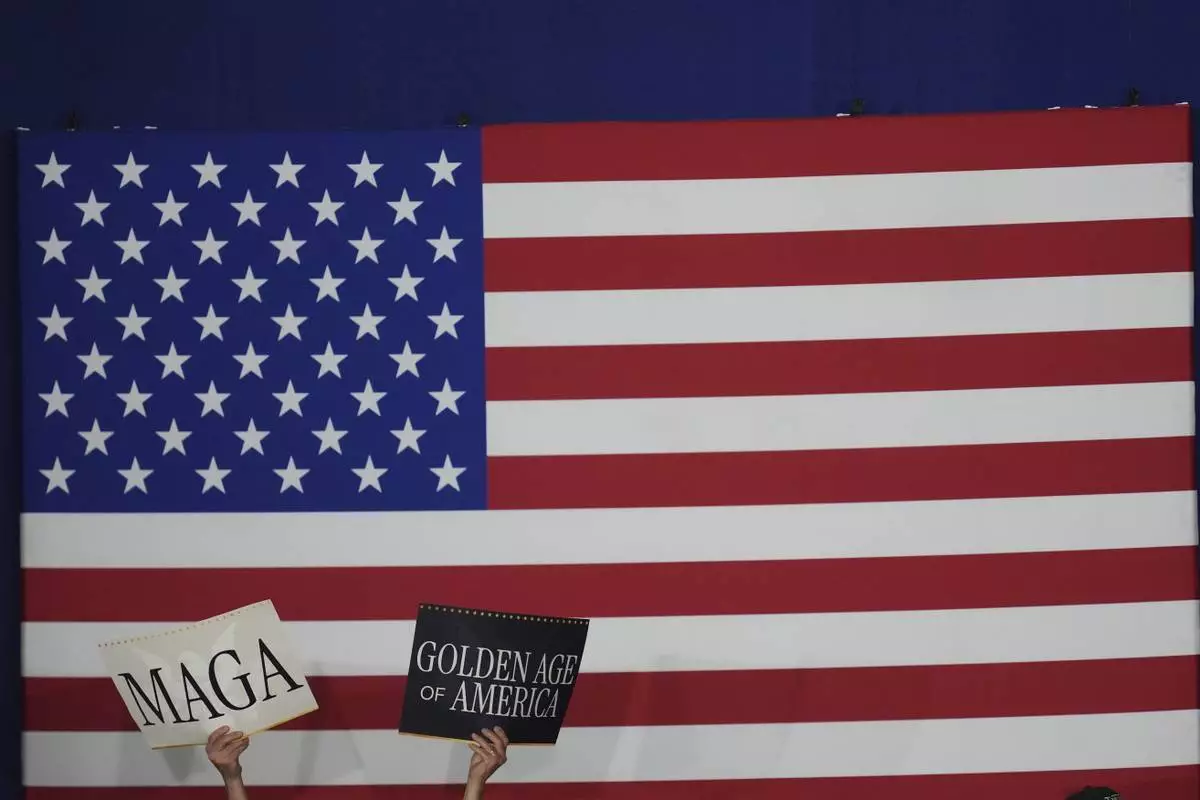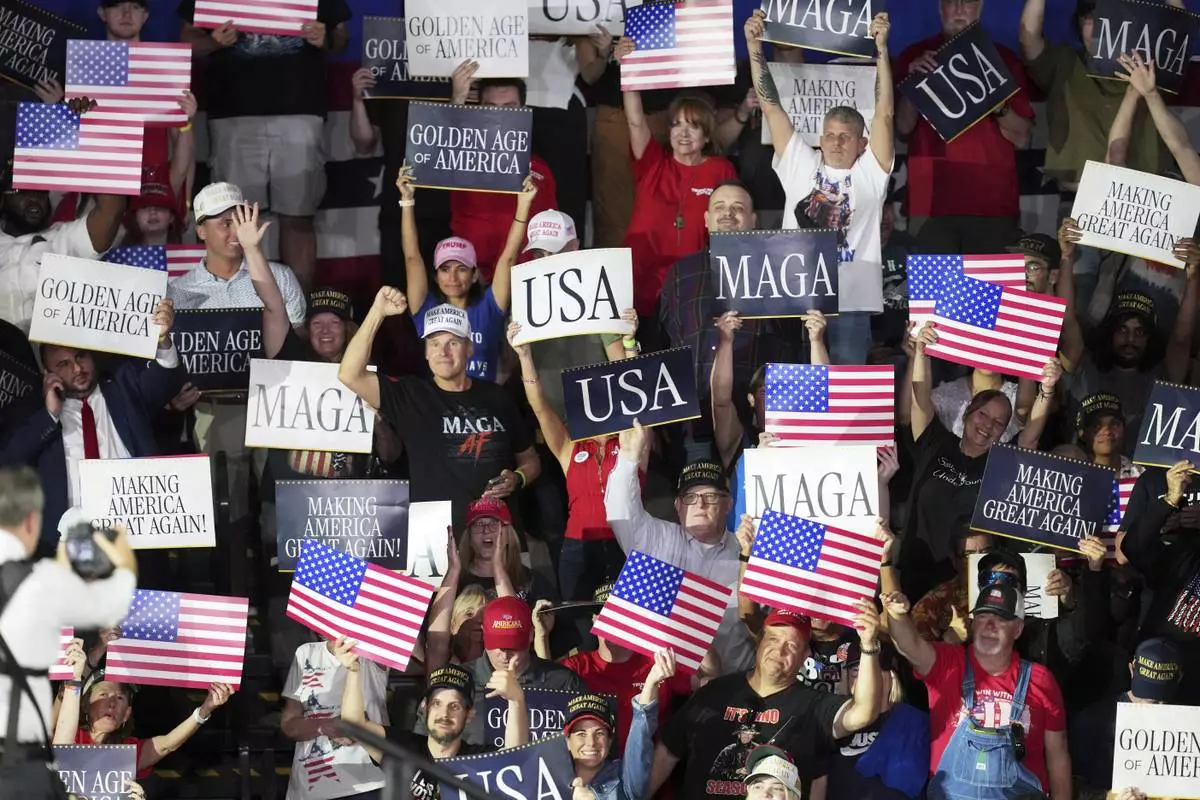 Supporters hold signs as President Donald Trump speaks on his first 100 days at Macomb County Community College Sports Expo Center, Tuesday, April 29, 2025, in Warren, Mich. (AP Photo/Paul Sancya)
