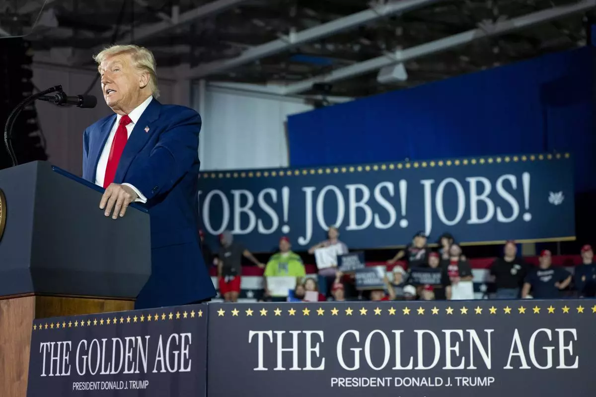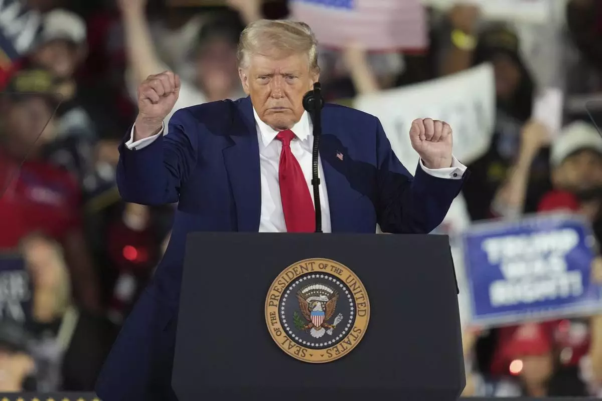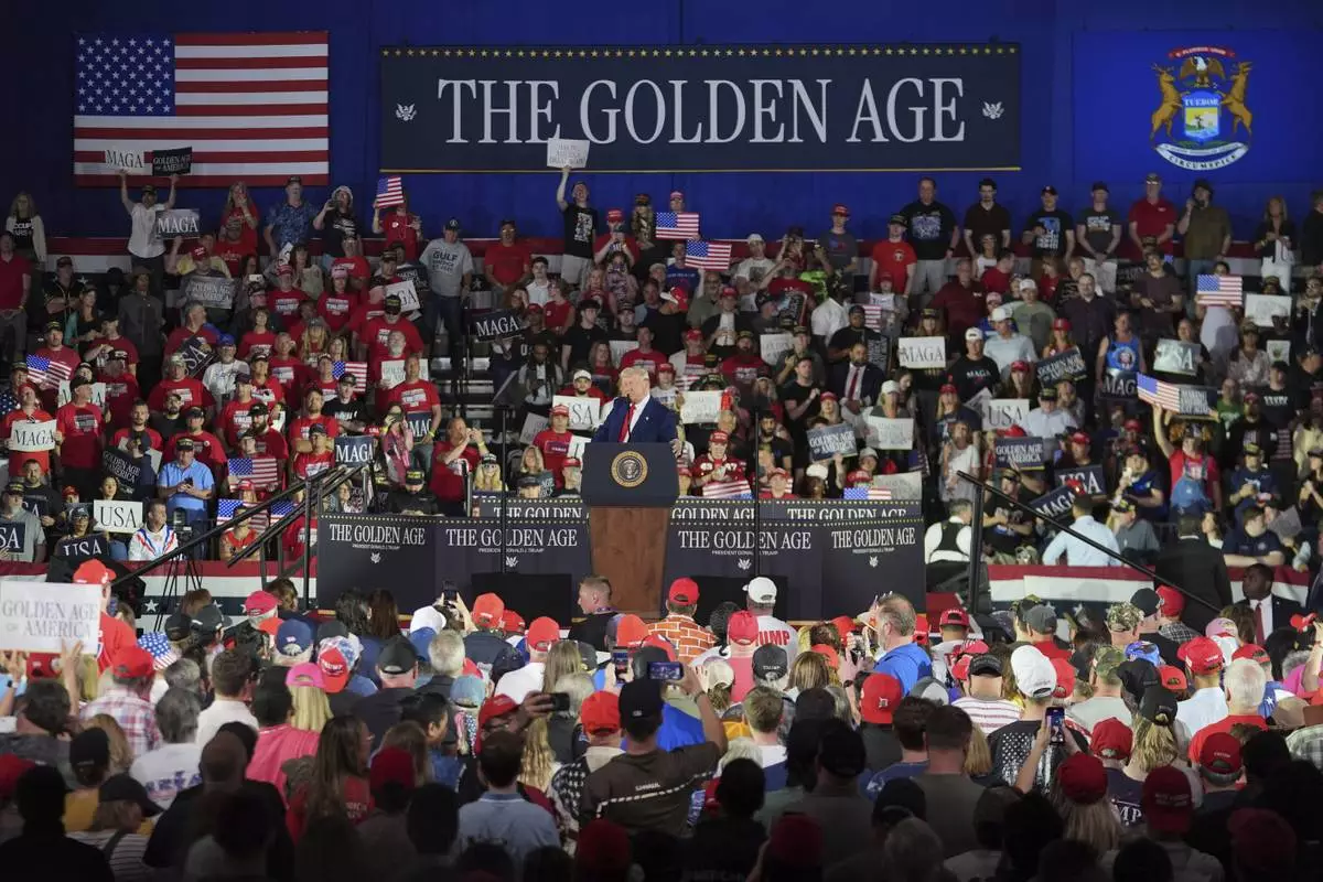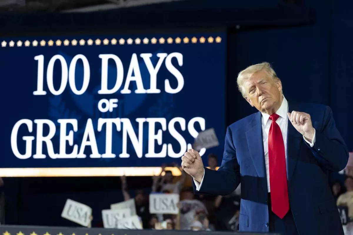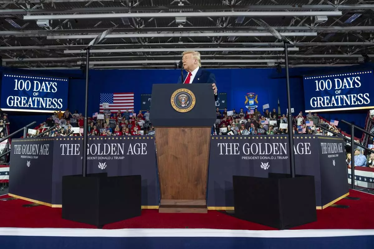President Donald Trump speaks on his first 100 days at Macomb County Community College Sports Expo Center, Tuesday, April 29, 2025, in Warren, Mich. (AP Photo/Paul Sancya)