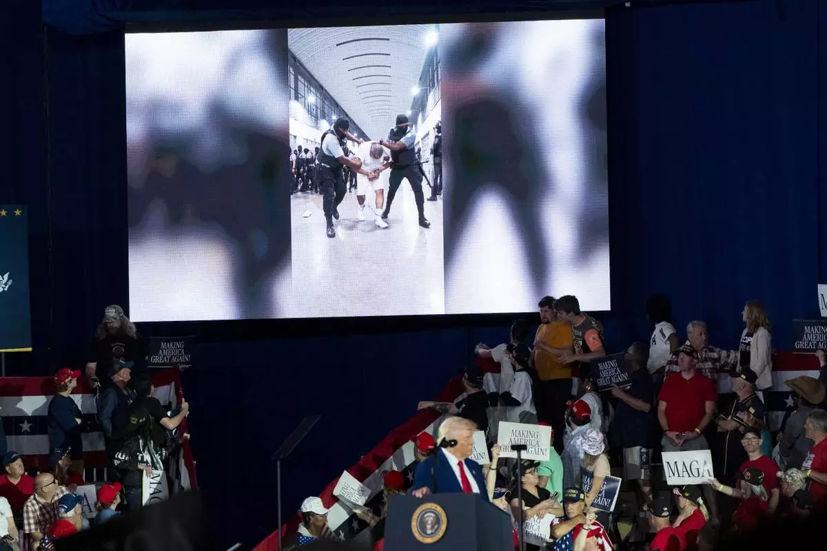 President Donald Trump shows a video on detainees in El Salvador as he speaks on his first 100 days at Macomb County Community College Sports Expo Center, Tuesday, April 29, 2025, in Warren, Mich. (AP Photo/Alex Brandon)