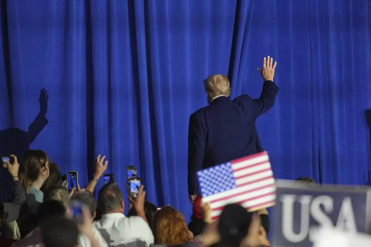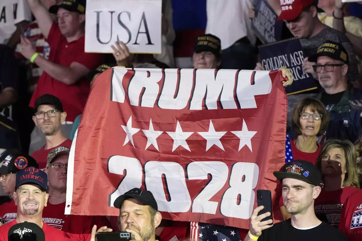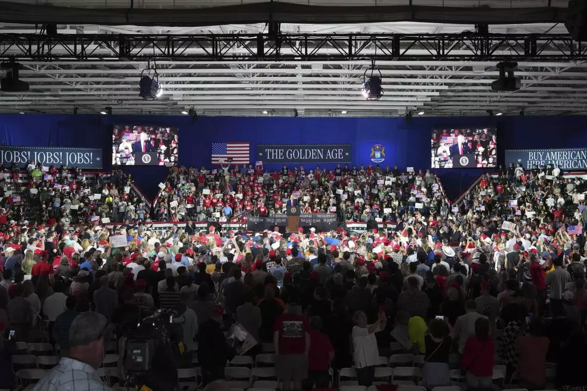 People arrive before President Donald Trump speaks on his first 100 days at Macomb County Community College Sports Expo Center, Tuesday, April 29, 2025, in Warren, Mich. (AP Photo/Paul Sancya)