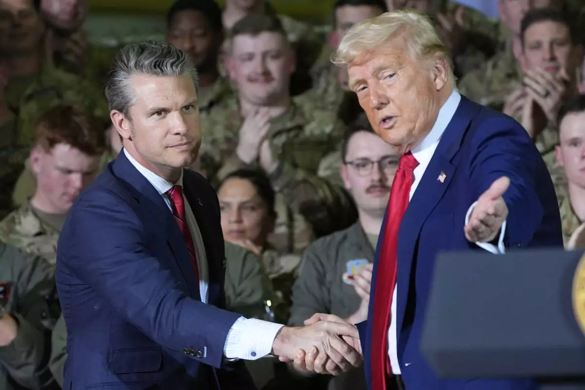 President Donald Trump shakes hands with Defense Secretary Pete Hegseth as he speaks to members of the Michigan National Guard at Selfridge Air National Guard Base, Tuesday, April 29, 2025, in Harrison Township, Mich. (AP Photo/Alex Brandon)