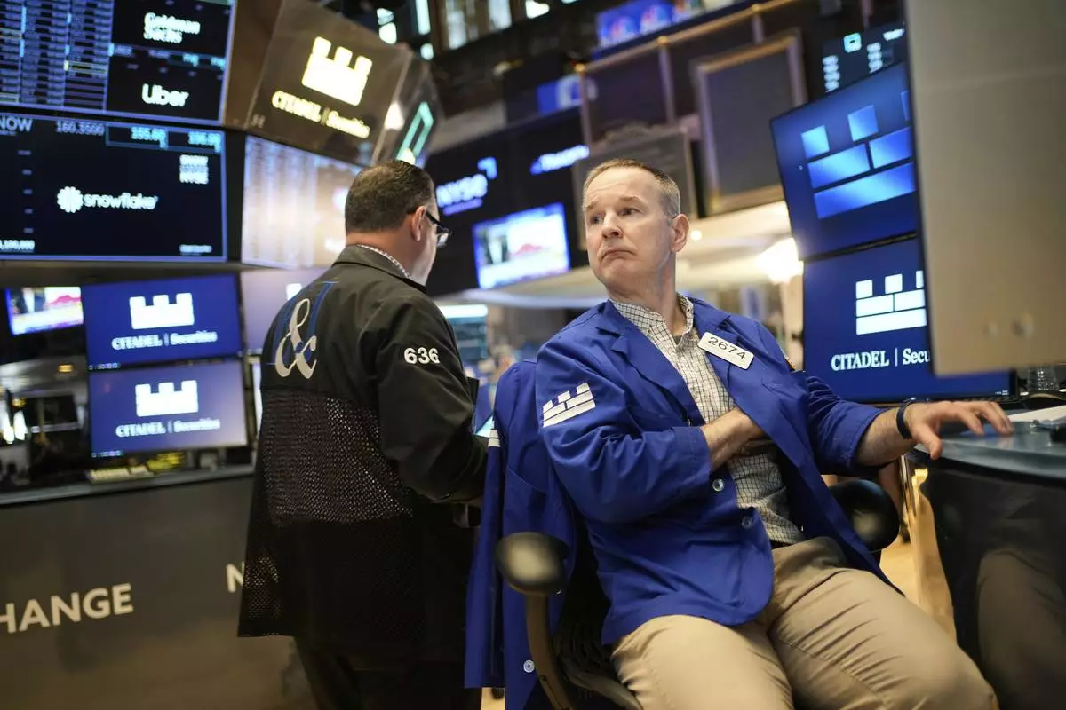Trader Peter Tuchman, foreground, works on the floor of the New York Stock Exchange, Tuesday, April 29, 2025. (AP Photo/Richard Drew)