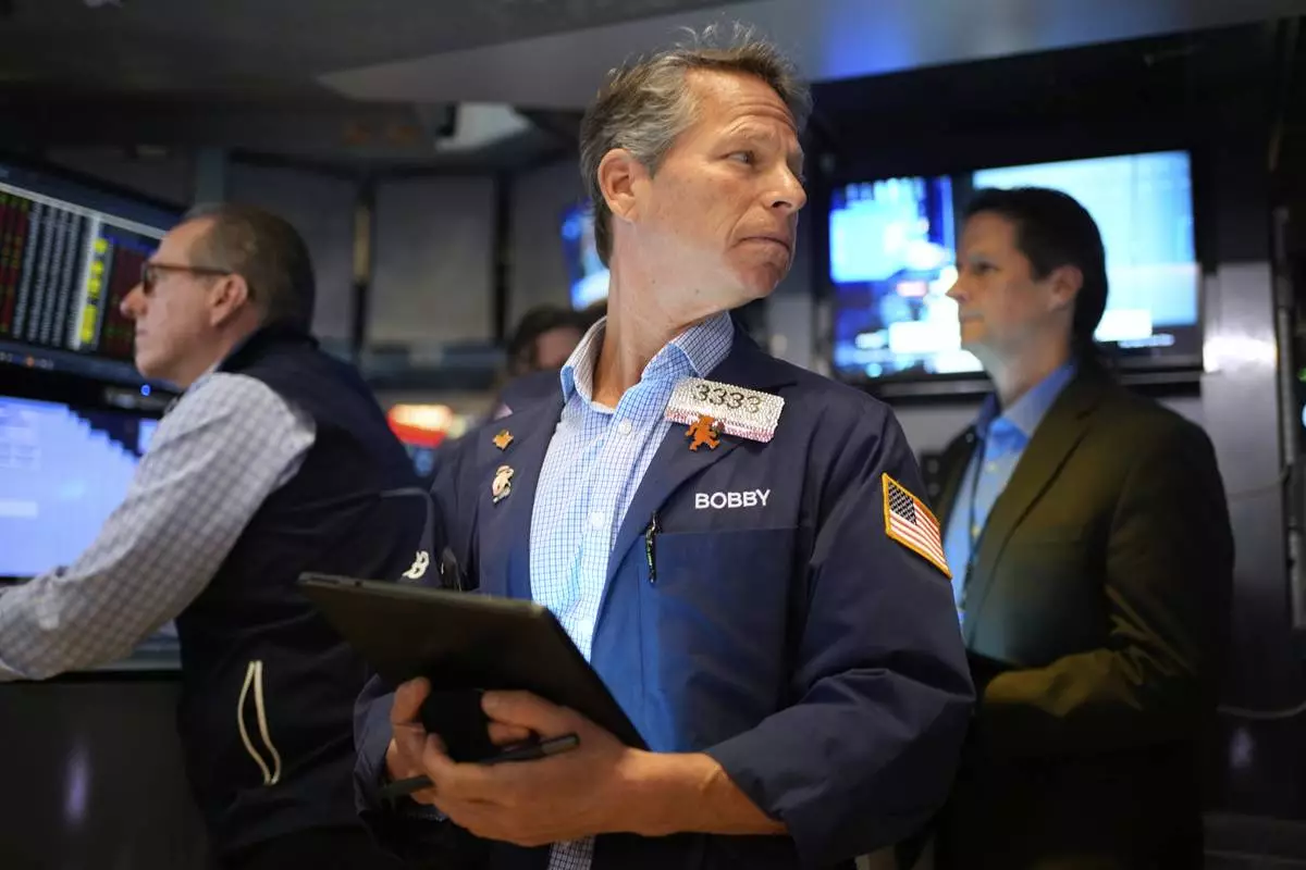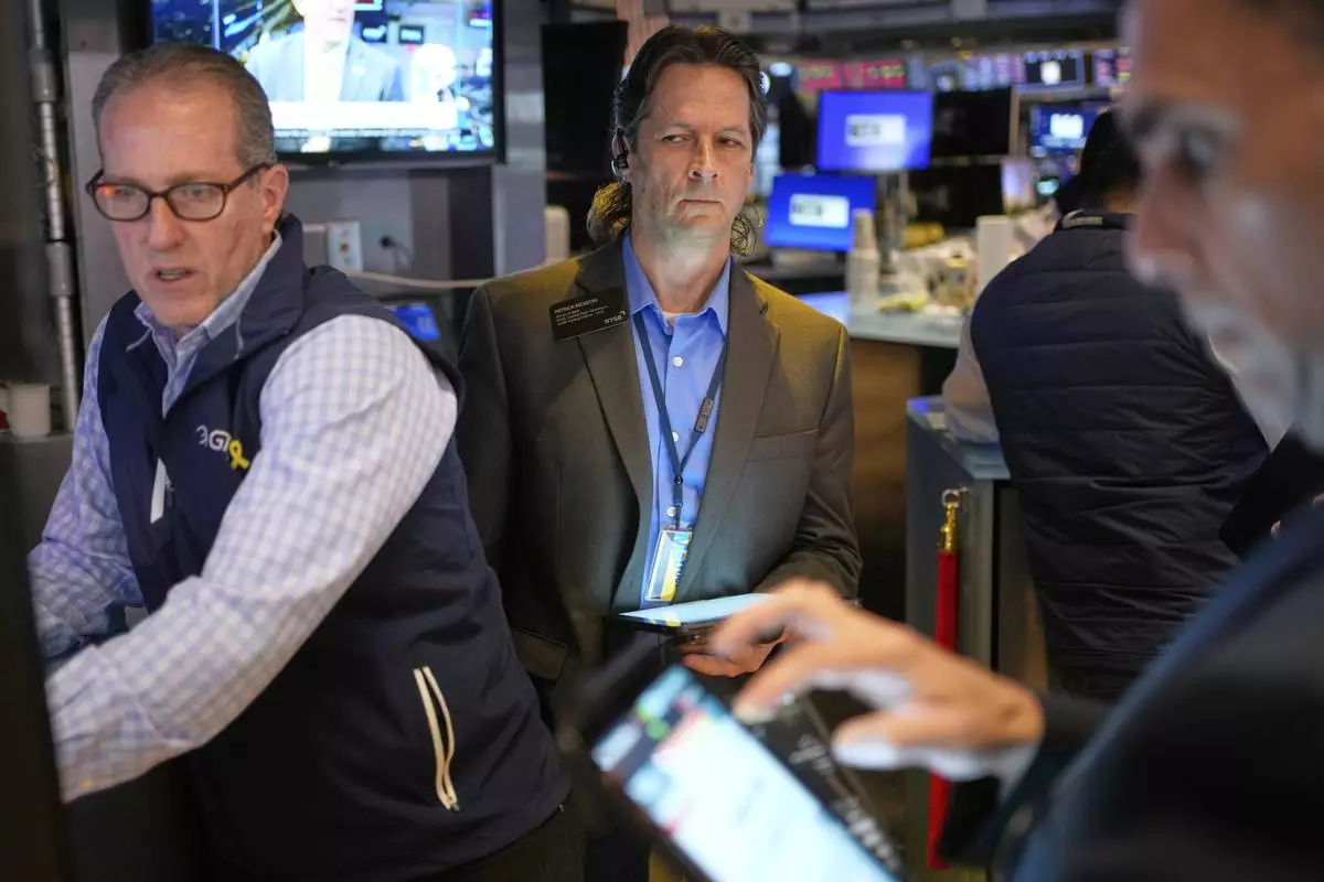 Bobby Charmak, center, works on the floor at the New York Stock Exchange in New York, Wednesday, April 30, 2025. (AP Photo/Seth Wenig)