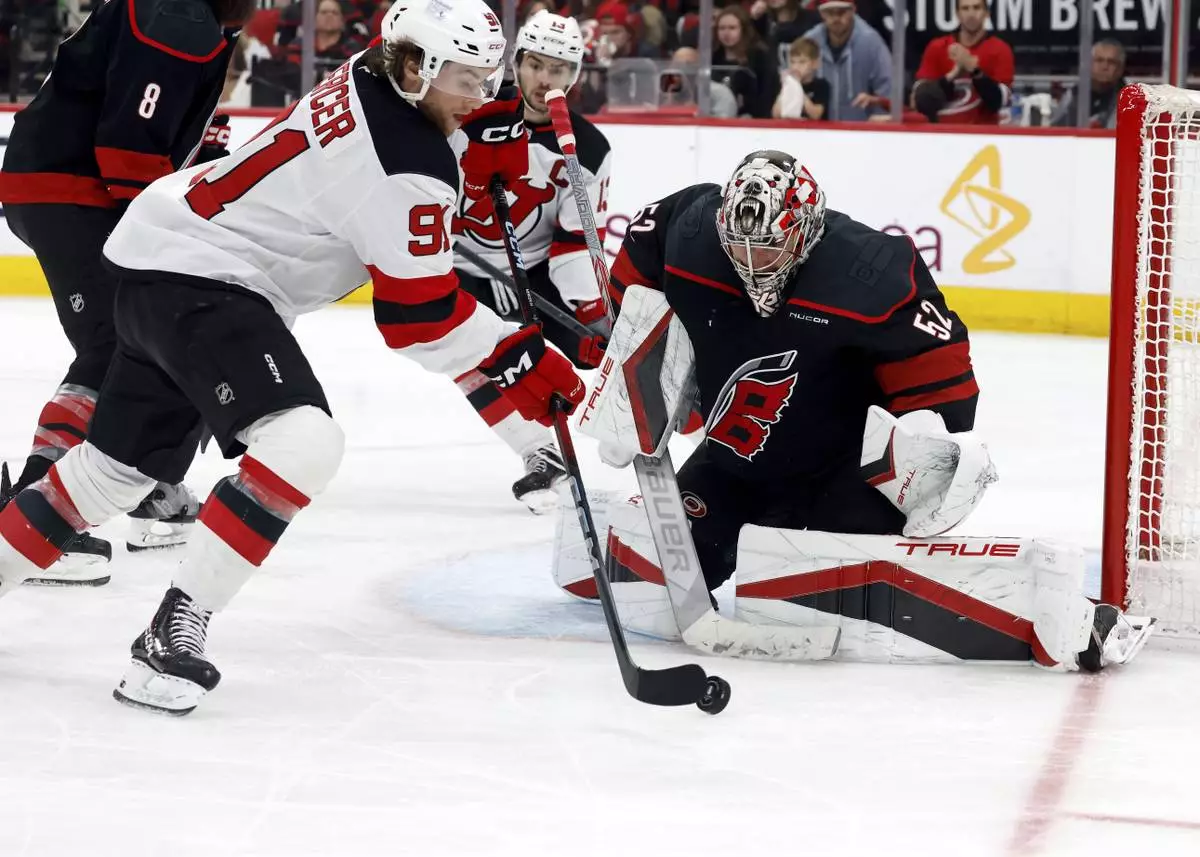 Mercer, Timo Meier and Stefan Noesen scored during New Jersey’s game-opening flurry, then Nico Hischier added a second-period goal for a 4-3 lead that provided a brief pause to Carolina's avalanche.