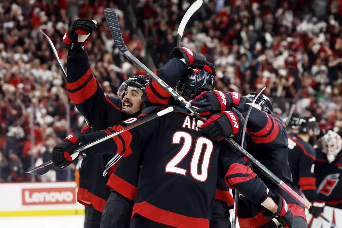 Carolina Hurricanes' Seth Jarvis, left, salutes the crowd from the celebration of Sebastian Aho's game-winning goal during the second overtime period of Game 5 of an NHL hockey Stanley Cup first-round playoff series against the New Jersey Devils in Raleigh, N.C., Tuesday, April 29, 2025. (AP Photo/Karl DeBlaker)