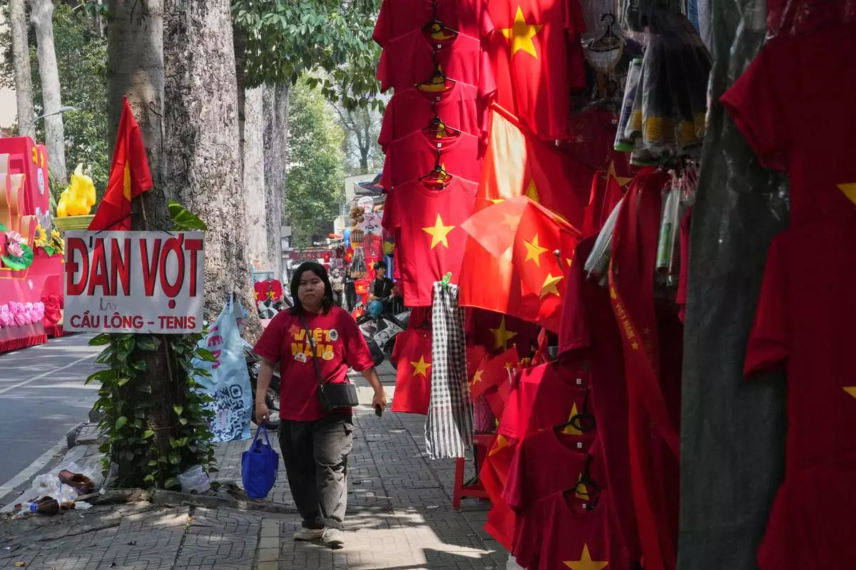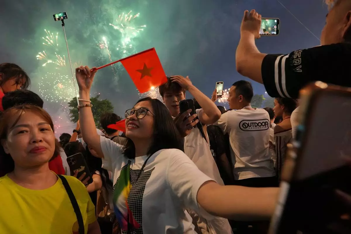 A woman walks after watching a parade celebrating the 50th anniversary of the end of the Vietnam War in Ho Chi Minh City, Vietnam, Wednesday, April 30, 2025. (AP Photo/Achmad Ibrahim)
