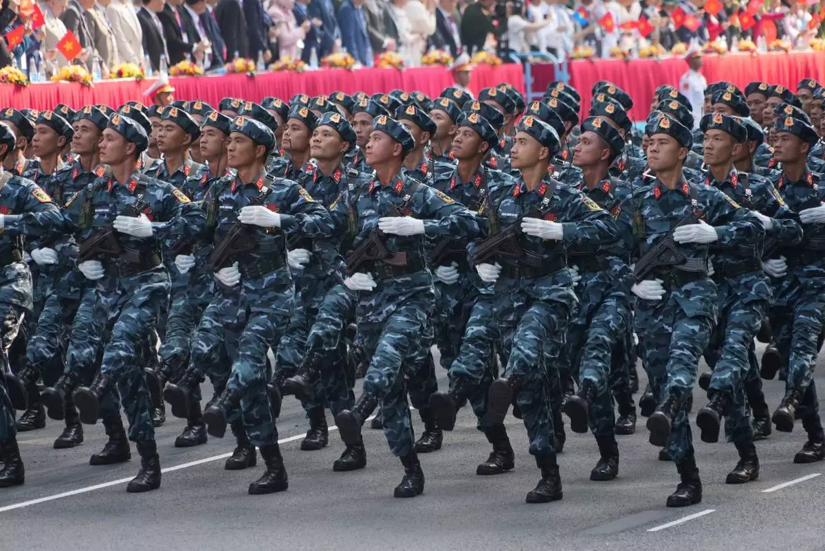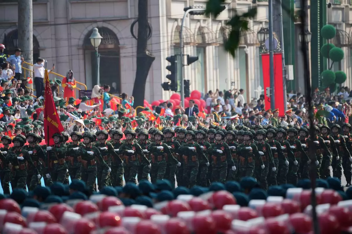 Vietnamese troops march during a parade to commemorate the 50th anniversary of the end of the Vietnam War in Ho Chi Minh City, Vietnam Wednesday, April 30, 2025. (AP Photo/Hau Dinh)