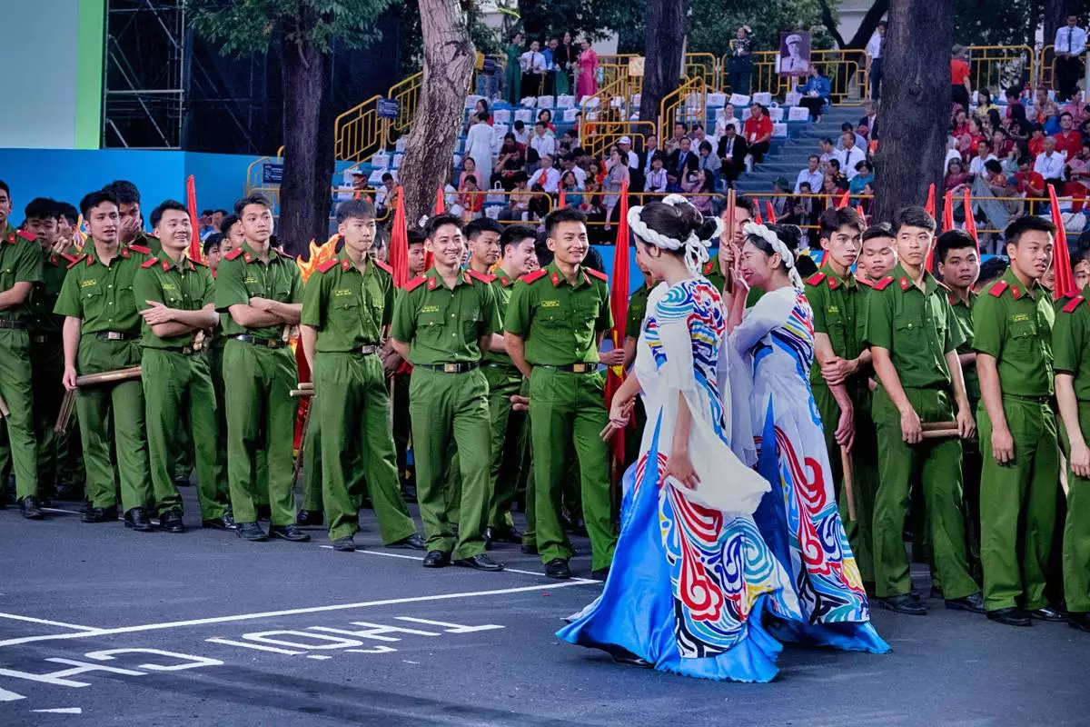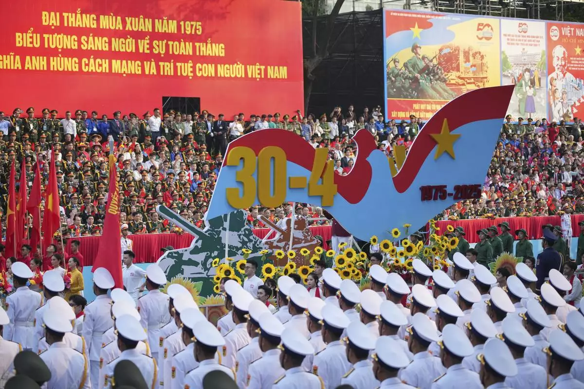Vietnamese dancers perform during a parade celebrating the 50th anniversary of the end of the Vietnam War in Ho Chi Minh City, Vietnam, Wednesday, April 30, 2025. (AP Photo/Achmad Ibrahim)