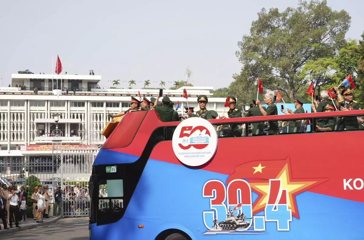 Vietnam War veterans on an open bus take part in a parade to commemorate the 50th anniversary of the end of the Vietnam War in Ho Chi Minh City Wednesday, April 30, 2025. (AP Photo/Hau Dinh)