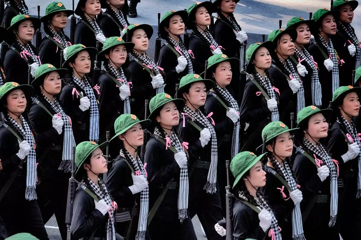 Women soldiers in North Vietnamese Army costumes march during a parade celebrating the 50th anniversary of the end of the war on Wednesday, April 30, 2025, in Ho Chi Minh City, Vietnam. (AP Photo/Richard Vogel)