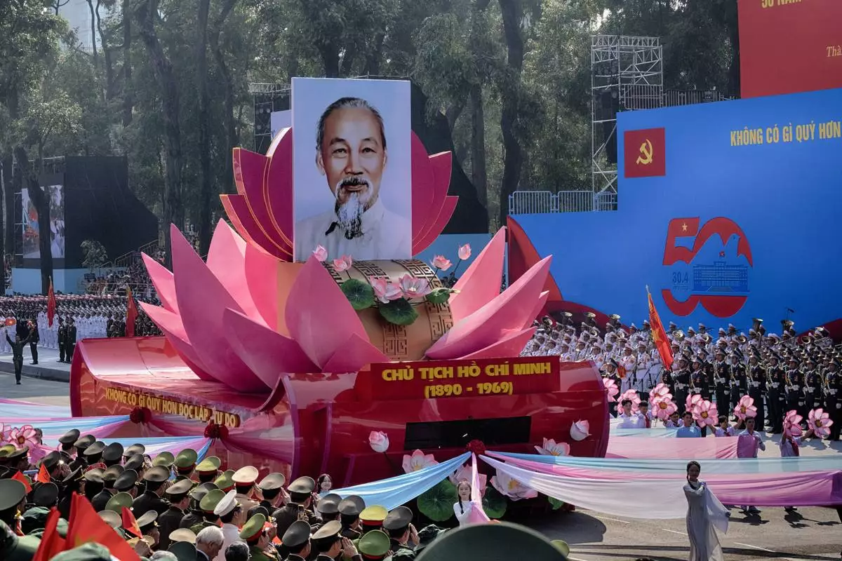 A float carrying a portrait of the late Vietnamese revolutionary leader Ho Chi Minh takes part in a parade during the 50th anniversary celebration of the end of the Vietnam War Wednesday, April 30, 2025, in Ho Chi Minh City, Vietnam. (AP Photo/Achmad Ibrahim)