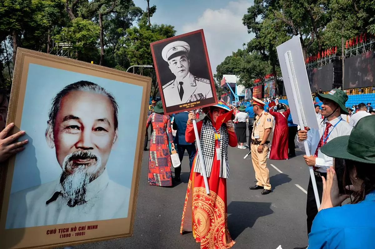 A woman is photographed with a photo of the late wartime Vietnamese Gen. Vo Nguyen Giap as another person holds a photo of the late Vietnamese revolutionary leader Ho Chi Minh, left, after a parade celebrating the 50th anniversary of the end of the Vietnam War on Wednesday, April 30, 2025, in Ho Chi Minh City, Vietnam. (AP Photo/Richard Vogel)