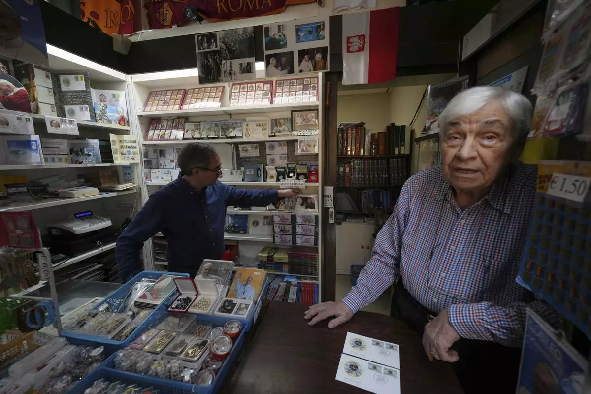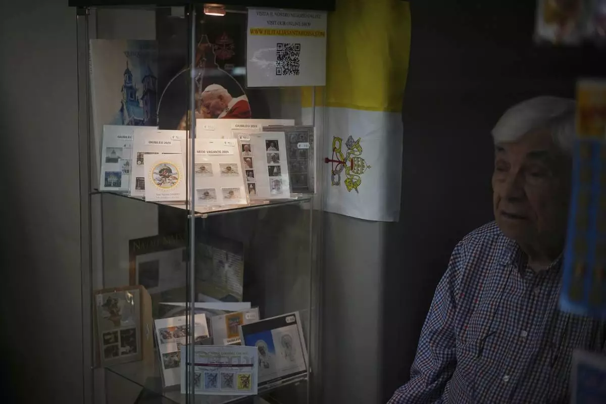 Ermenegildo Santarossa sits in his Filitalia stamps, coins, and souvenirs shop next to the Vatican walls, in Rome, Tuesday, April 29, 2025. (AP Photo/Andrew Medichini)