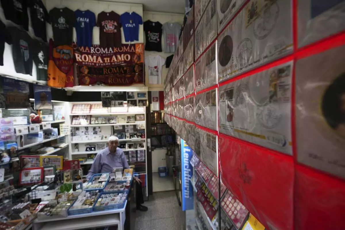A view of the Filitalia stamps, coins, and souvenirs shop just next to the Vatican walls, in Rome, Tuesday, April 29, 2025. (AP Photo/Andrew Medichini)