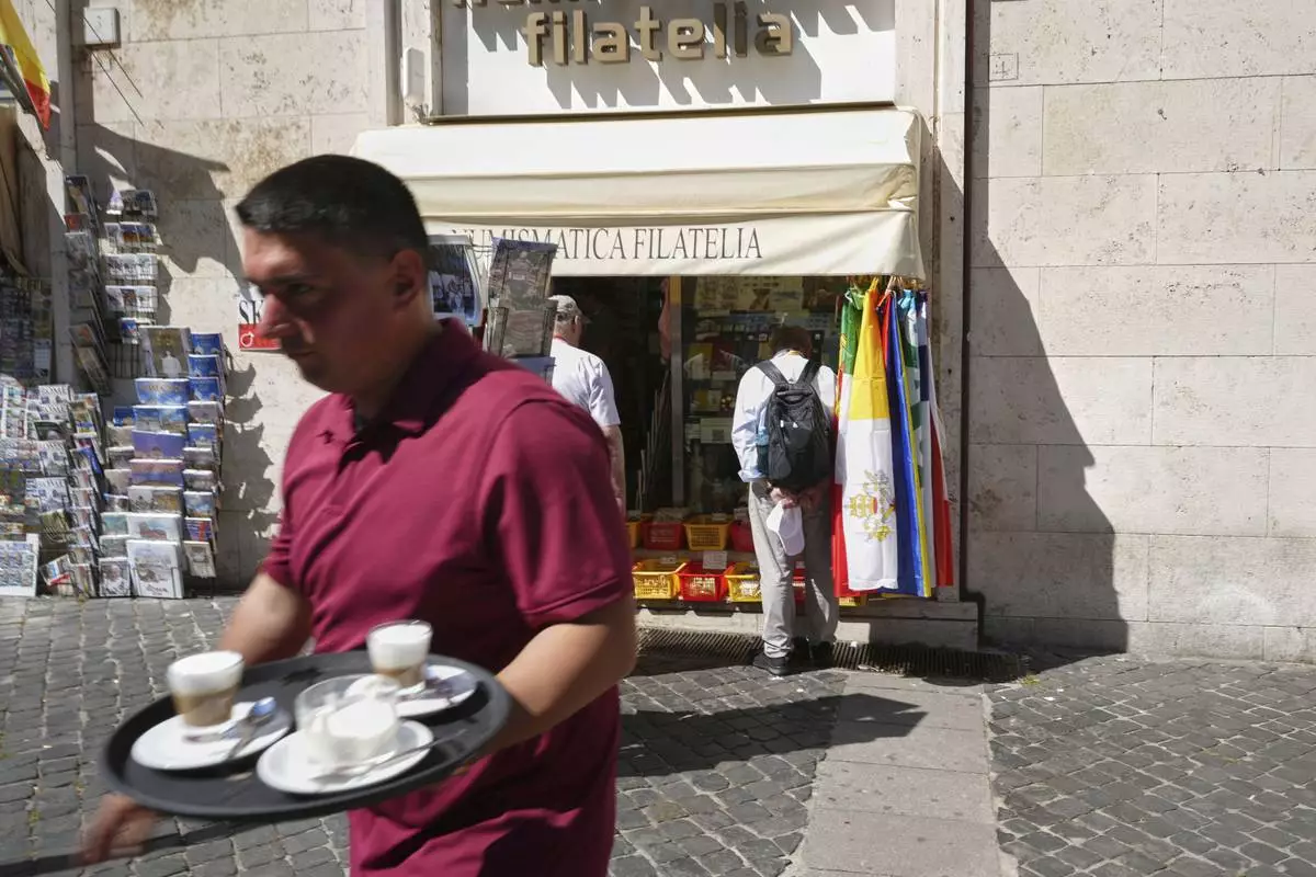 A waiter carries coffees as he walks past the Filitalia stamps, coins, and souvenirs shop just next to the Vatican walls, in Rome, Tuesday, April 29, 2025. (AP Photo/Andrew Medichini)