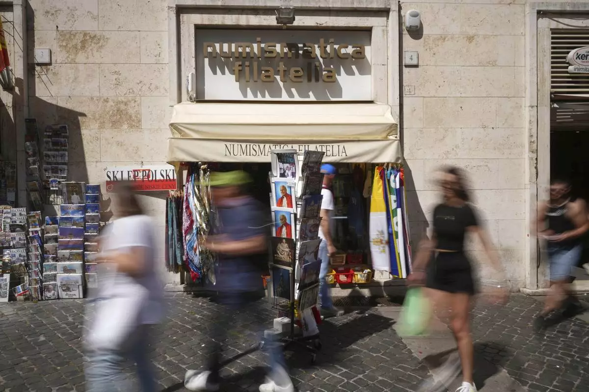 People walk past the Filitalia stamps, coins, and souvenirs shop next to the Vatican walls in Rome, Tuesday, April 29, 2025. (AP Photo/Andrew Medichini)