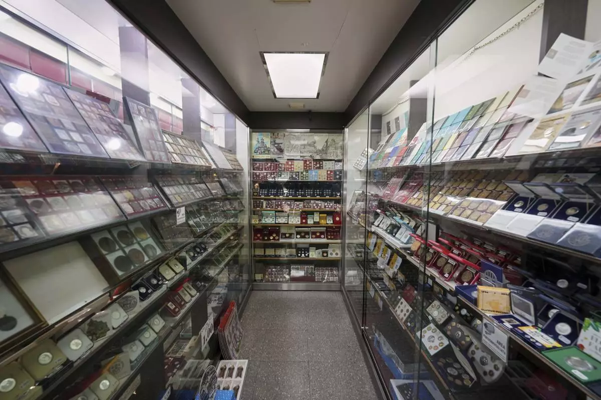 Ermenegildo Santarossa sits in his Filitalia stamps, coins, and souvenirs shop next to the Vatican walls in Rome, Tuesday, April 29, 2025. (AP Photo/Andrew Medichini)