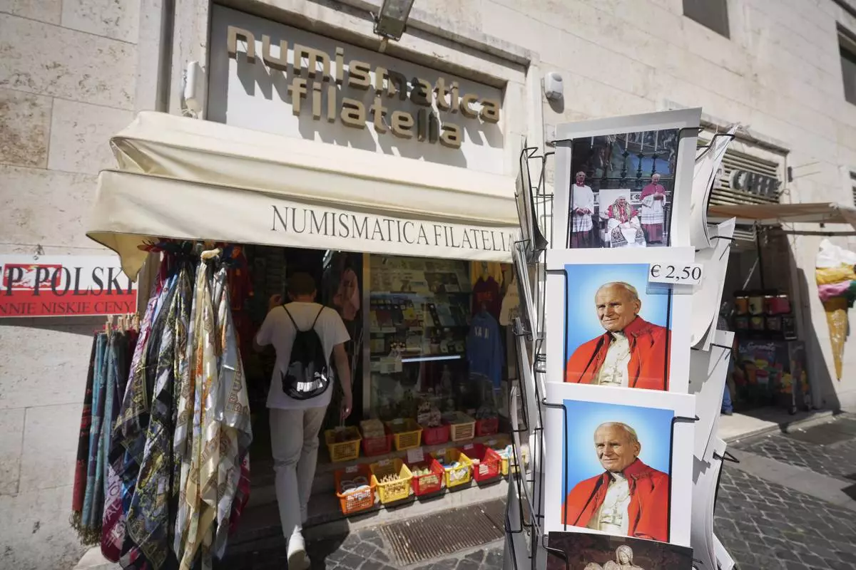 A person enters the Filitalia stamps, coins, and souvenirs shop just next to the Vatican walls in Rome, Tuesday, April 29, 2025. (AP Photo/Andrew Medichini)