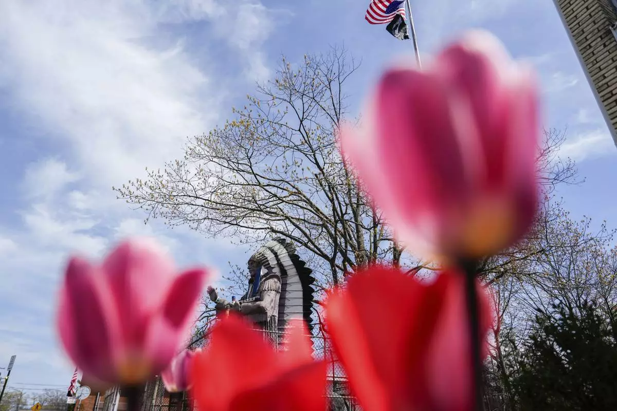 The Big Chief Lewis statue stands in Massapequa, N.Y., Friday, April 25, 2025. (AP Photo/Julia Demaree Nikhinson)