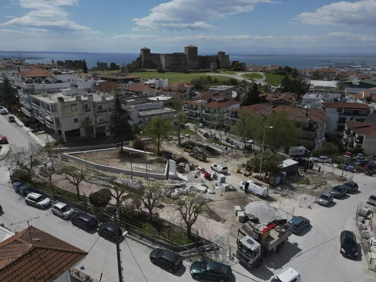 A drone photo shows a square where mass graves have been uncovered with remains believed to be dozens of prisoners slain during or after the Greek Civil War, in Thessaloniki, Greece, on Saturday, April 12, 2025. (AP Photo/Thanassis Stavrakis)