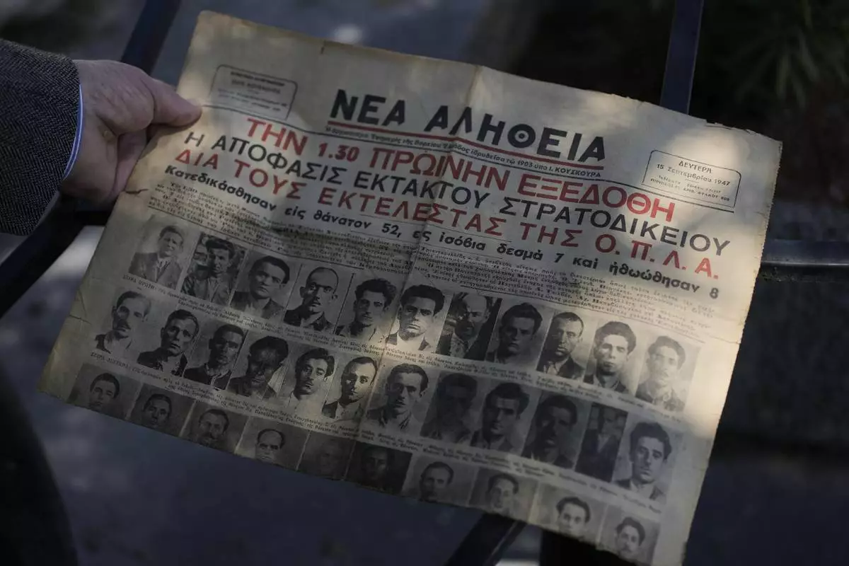 Author and historian Spyros Kouzinopoulos holds a newspaper announcing the Sept. 15, 1947, court ruling to execute 52 people being held at Yedi Kule prison, which is now a museum, in Thessaloniki, Greece, on Saturday, April 12, 2025. (AP Photo/Thanassis Stavrakis)