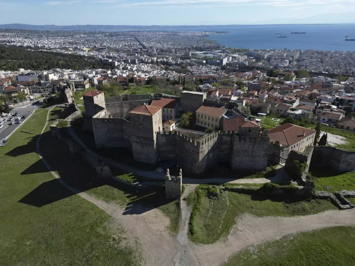 A drone photo shows Yedi Kule prison, which is now a museum, in Thessaloniki, Greece, Friday, April 11, 2025. (AP Photo/Thanassis Stavrakis)