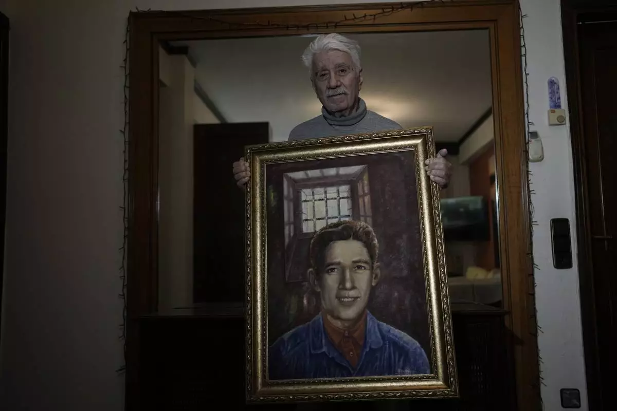 Agapios Sachinis holds a portrait of his uncle, a prisoner executed in the Greek Civil War, in Thessaloniki, Greece, on Saturday, April 12, 2025. (AP Photo/Thanassis Stavrakis)