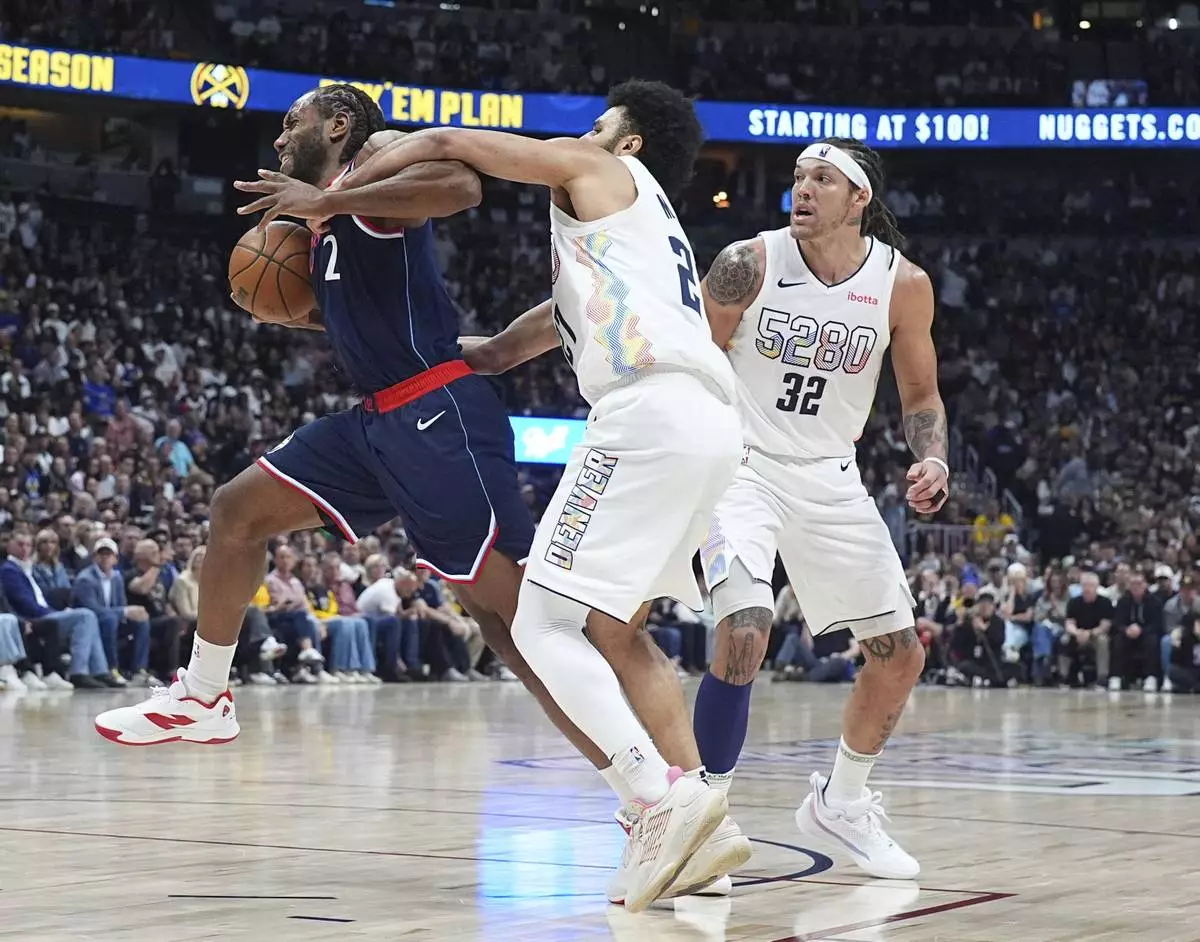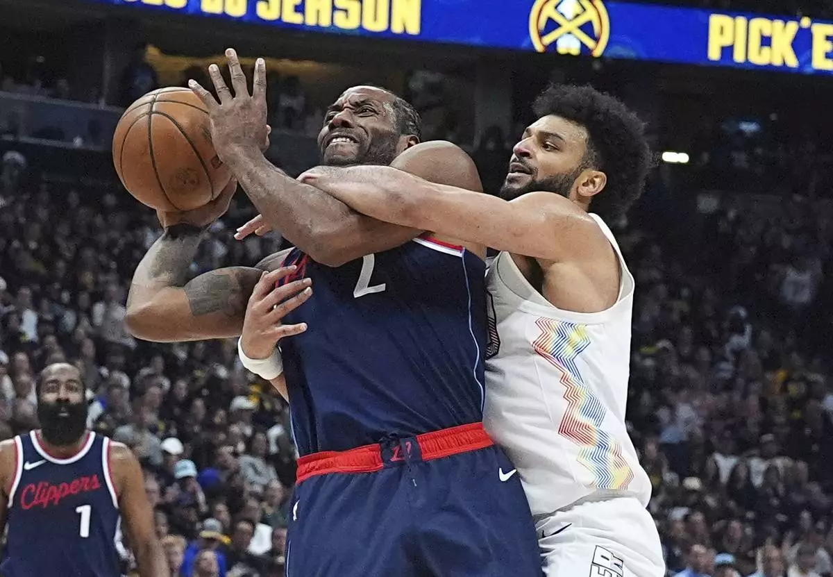 Los Angeles Clippers forward Kawhi Leonard, left, is fouled by Denver Nuggets guard Jamal Murray as forward Aaron Gordon (32) looks on in the second half of Game 5 of an NBA basketball playoff series Tuesday, April 29, 2025, in Denver. (AP Photo/David Zalubowski)