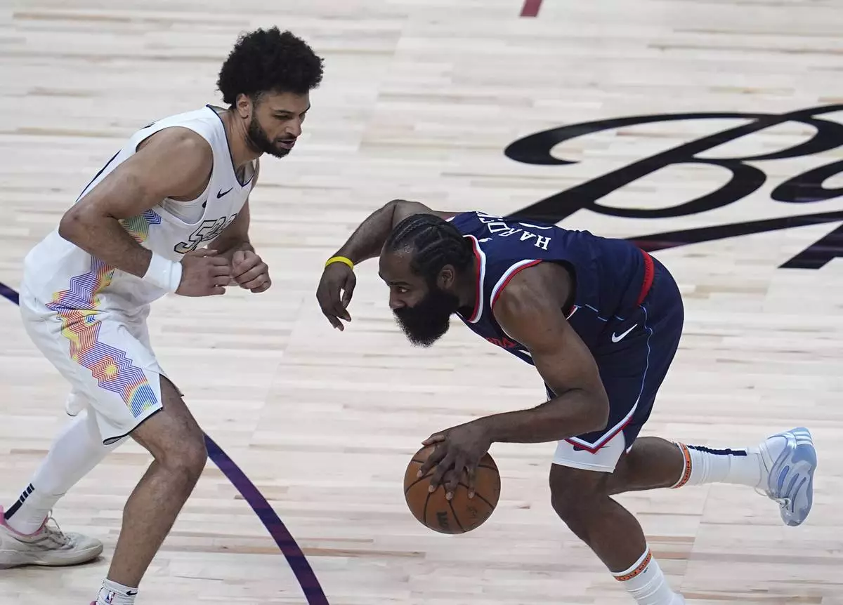 Los Angeles Clippers guard James Harden, right, collects a loose ball as Denver Nuggets guard Jamal Murray defends in the first half of Game 5 of an NBA basketball playoff series Tuesday, April 29, 2025, in Denver. (AP Photo/David Zalubowski)