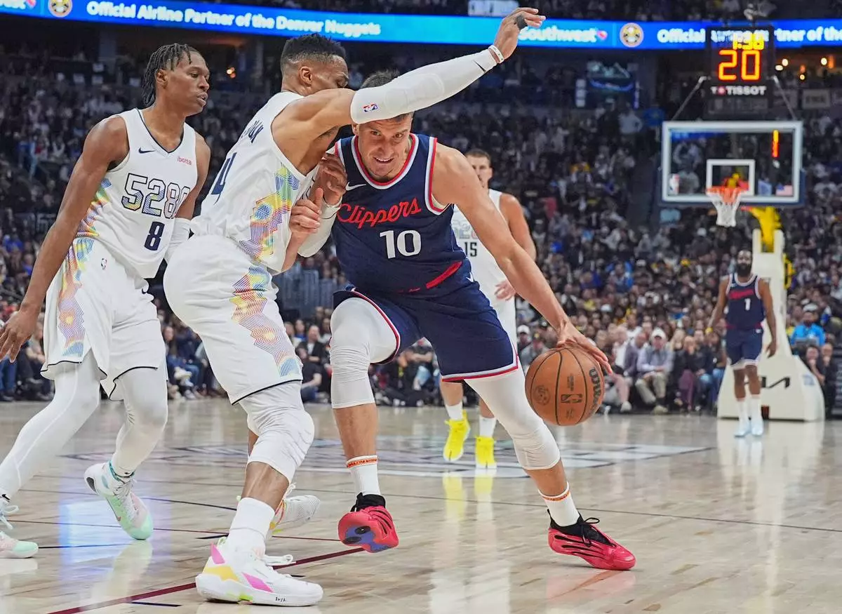 Los Angeles Clippers guard Bogdan Bogdanovic, right, struggles to drive to the basket as Denver Nuggets guard Russell Westbrook defends in the second half of Game 5 of an NBA basketball playoff series Tuesday, April 29, 2025, in Denver. (AP Photo/David Zalubowski)