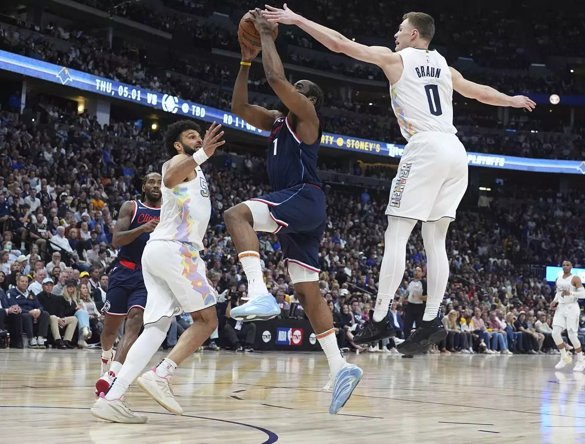 Los Angeles Clippers guard James Harden, center, drives to the basket between Denver Nuggets guards Jamal Murray, left, and Christian Braun (0) in the second half of Game 5 of an NBA basketball playoff series Tuesday, April 29, 2025, in Denver. (AP Photo/David Zalubowski)