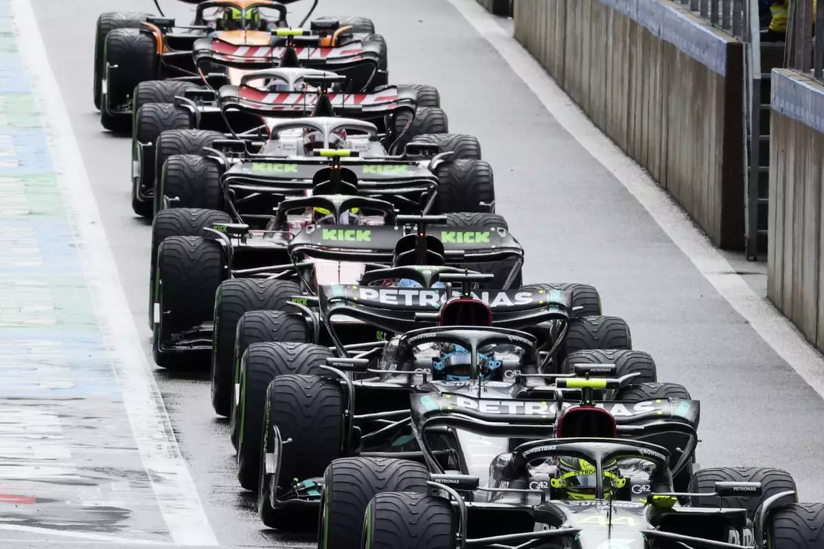 FILE - Drivers get ready for the start of the sprint shootout ahead of the Formula One Grand Prix at the Spa-Francorchamps racetrack in Spa, Belgium, Saturday, July 29, 2023. (AP Photo/Geert Vanden Wijngaert, File)