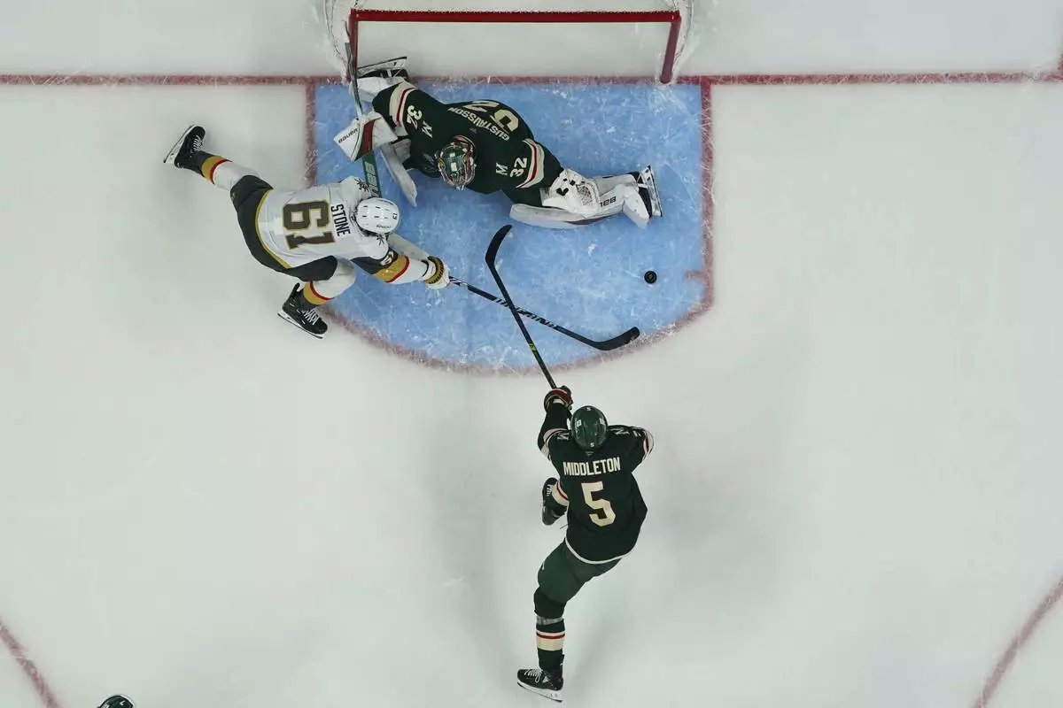 Minnesota Wild goaltender Filip Gustavsson (32) and defenseman Jake Middleton (5) defend against a shot attempt by Vegas Golden Knights right wing Mark Stone (61) during the third period of Game 3 of a first-round NHL hockey playoff series Thursday, April 24, 2025, in St. Paul, Minn. (AP Photo/Abbie Parr)