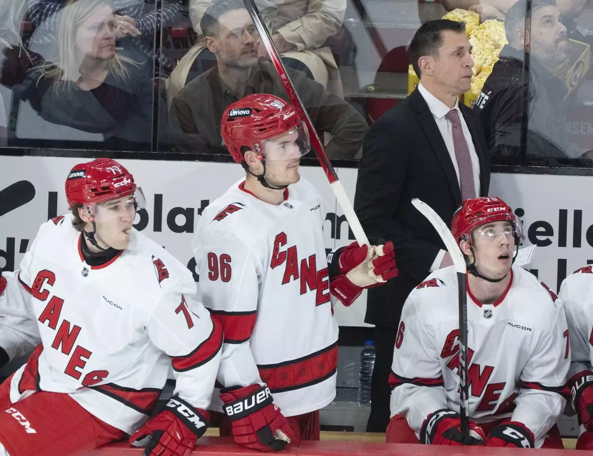 Carolina Hurricanes head coach Rod Brind'Amour watches action behind players Mark Jankowski (77), Jack Roslovic (96) and his son Skyler Brind'Amour during first period NHL hockey action against the Montreal Canadiens in Montreal on Wednesday, April 16, 2025. (Christinne Muschi/The Canadian Press via AP)