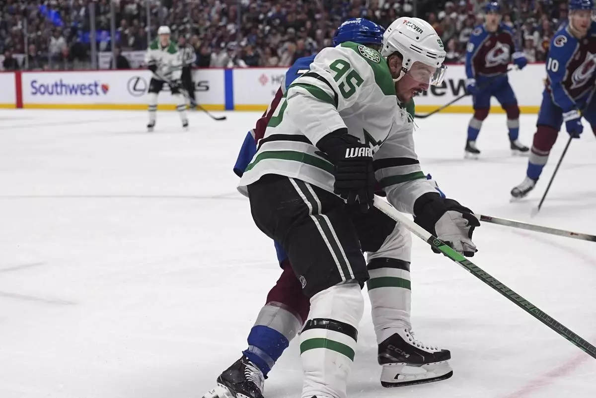 Dallas Stars center Matt Duchene, front, drives past Colorado Avalanche defenseman Sam Malinski in the second period of Game 3 of an NHL hockey first-round playoff series Wednesday, April 23, 2025, in Denver. (AP Photo/David Zalubowski)