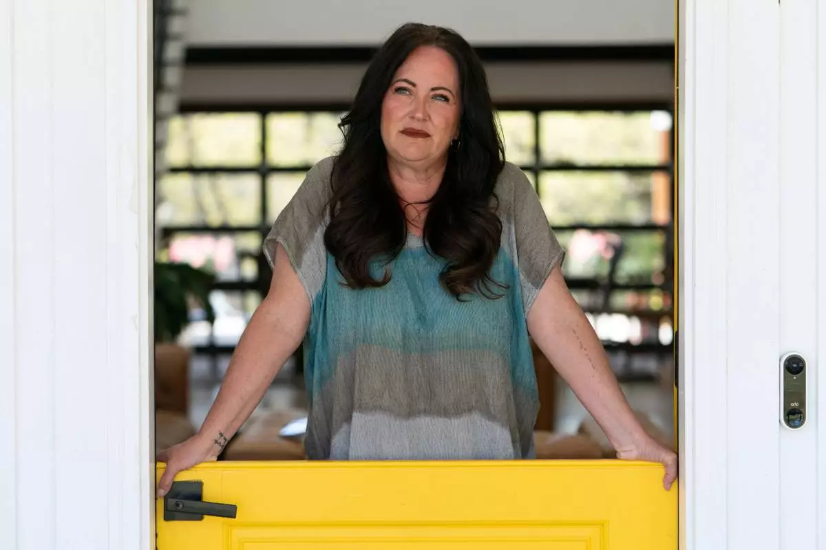 Erika Wright, a mother whose two school-age children attend a rural school district in Cleveland County poses for a portrait at her home in Noble, Okla., on Tuesday, April 15, 2025. (AP Photo/Nick Oxford)