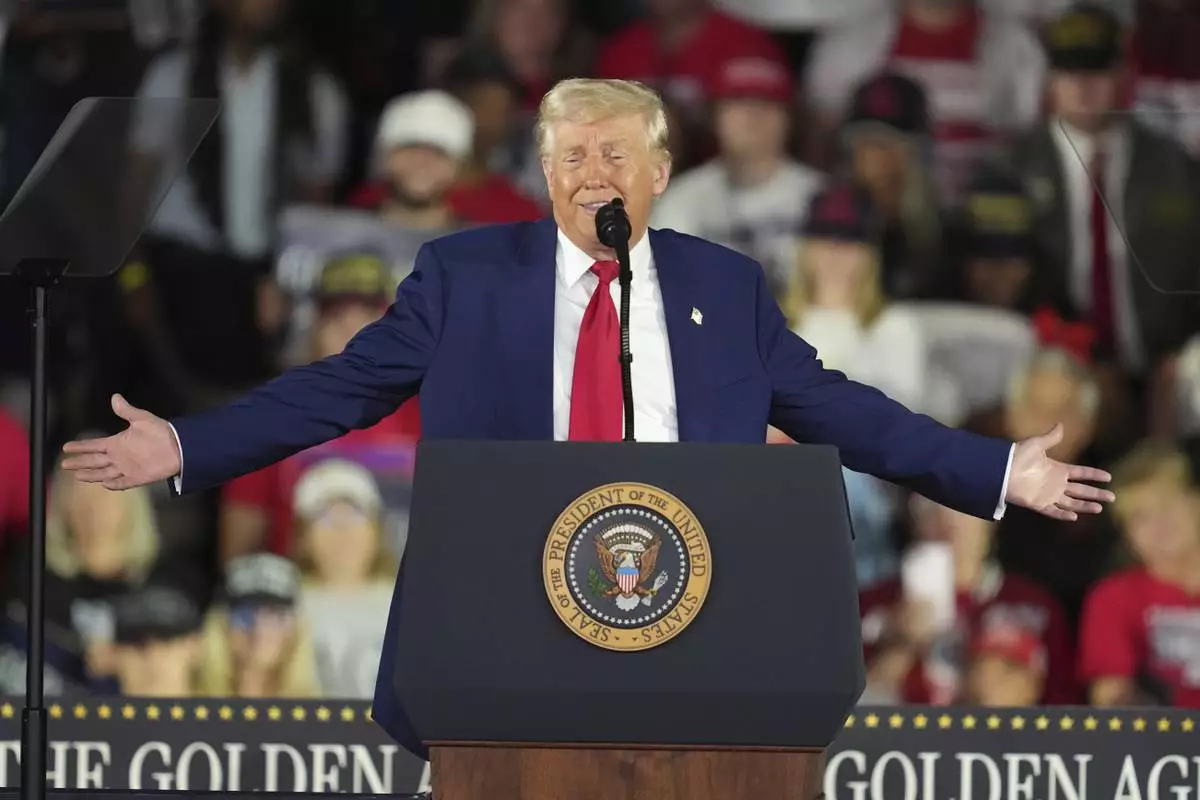President Donald Trump speaks on his first 100 days at Macomb County Community College Sports Expo Center, Tuesday, April 29, 2025, in Warren, Mich. (AP Photo/Paul Sancya)