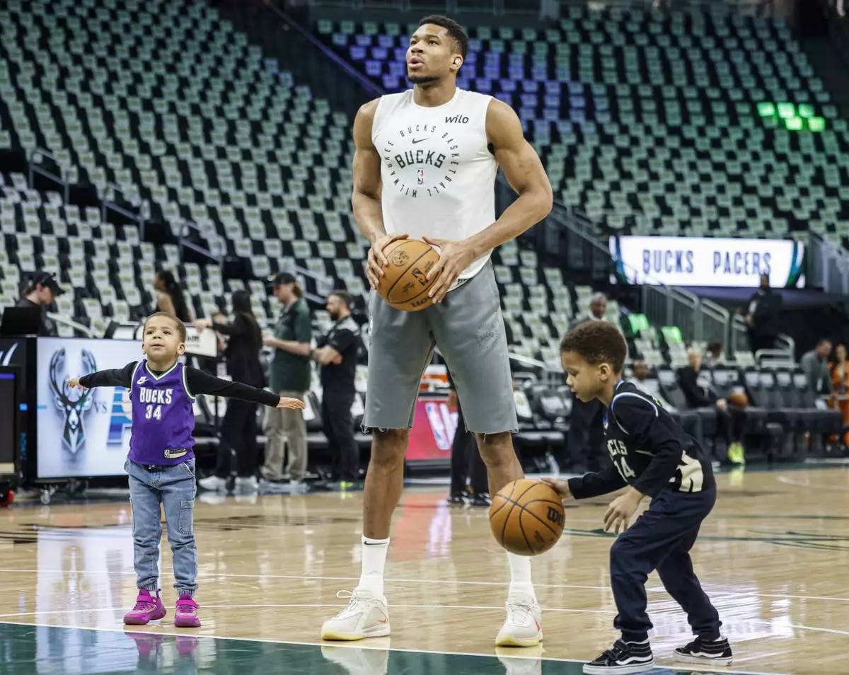 Milwaukee Bucks forward Giannis Antetokounmpo, center, warm up with his sons Maverick Shai, left, and Liam Charles, right, before Game 4 of an NBA basketball first-round playoff series against the Indiana Pacers, Sunday, April 27, 2025, in Milwaukee. (AP Photo/Jeffrey Phelps)