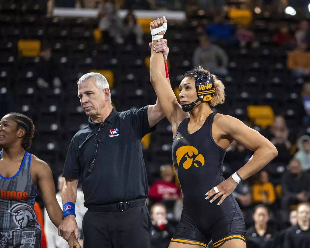 FILE - Iowa's Kennedy Blades is declared the winner after wrestling Indiana Tech's Cydney Bassett at 160 pounds during Day 1 of the Soldier Salute wrestling tournament at the Xtream Arena in Coralville, Iowa, on Sunday, Dec. 29, 2024. (Nick Rohlman/The Gazette via AP, File)
