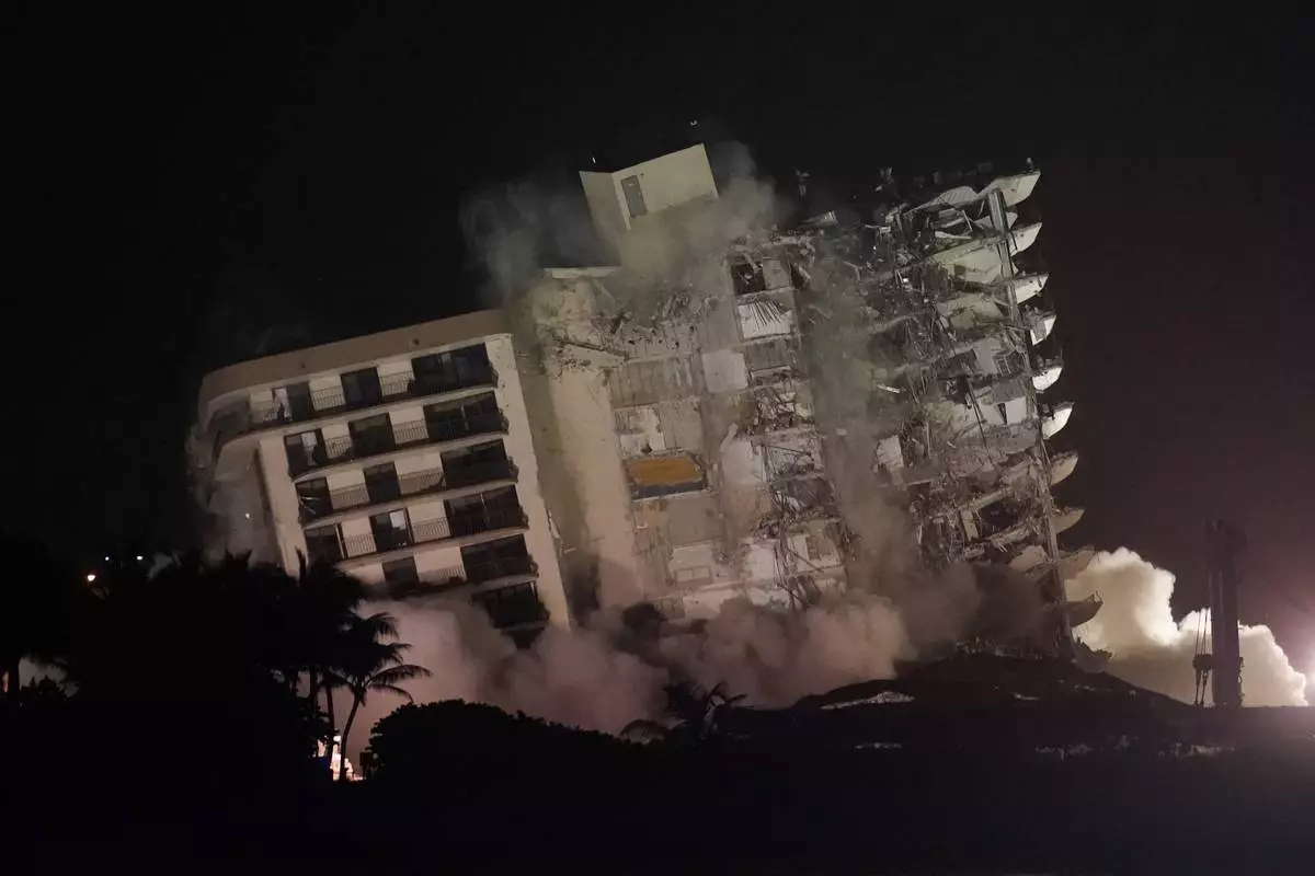 FILE - The damaged remaining structure at the Champlain Towers South condo building collapses in a controlled demolition, July 4, 2021, in Surfside, Fla. (AP Photo/Lynne Sladky, File)