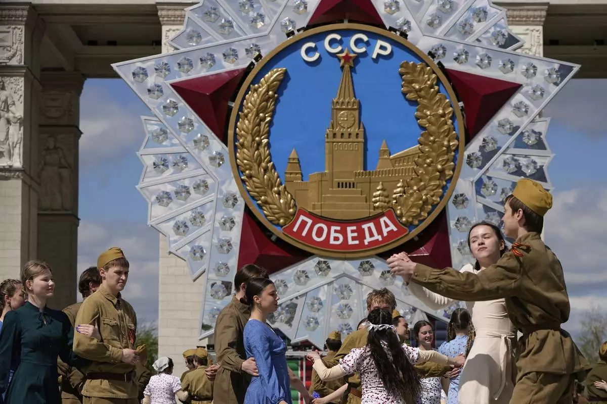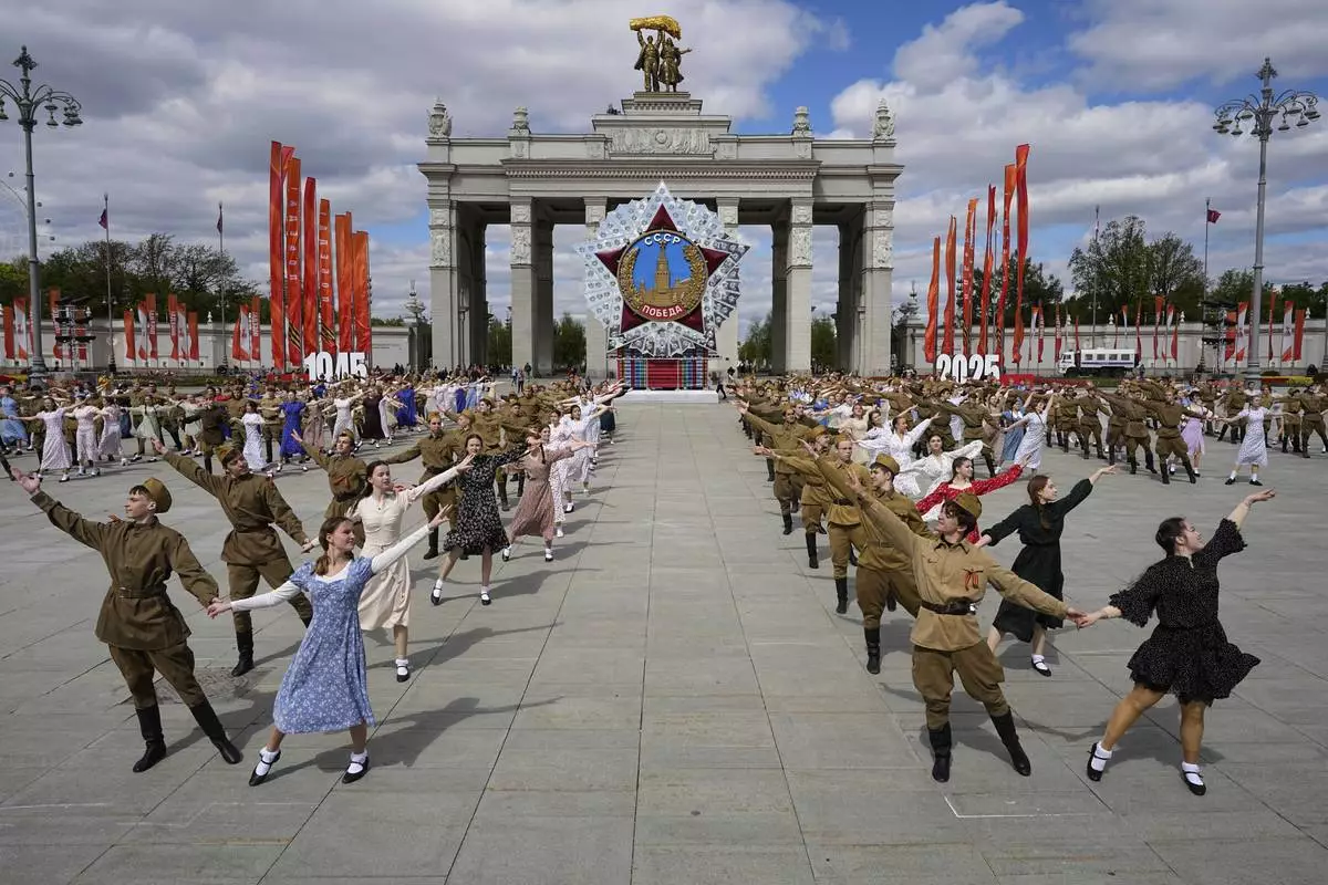 Moscow students dressed in the styles of the mid-1900s and Soviet uniform perform the Victory Waltz as a part of Victory Day celebration preparations in front of a model of the Order of Victory at the historical gate of VDNKh, or The Exhibition of Achievements of National Economy, in Moscow, Russia, Tuesday, May 6, 2025. (AP Photo/Alexander Zemlianichenko)