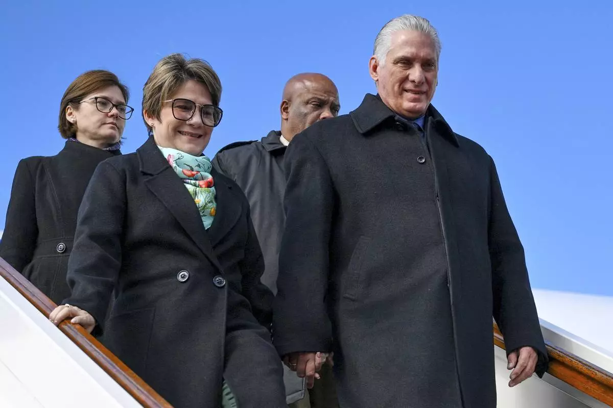 Cuba's President Miguel Diaz-Canel, right, and his wife Lis Cuesta Peraza, left, leave a plane upon arrival at the Vnukovo airport ahead of celebrations of the 80th anniversary of the Soviet Union's victory over Nazi Germany during the World War II, in Moscow, Russia, Tuesday, May 6, 2025. (Kirill Zykov/Photo host agency RIA Novosti via AP)