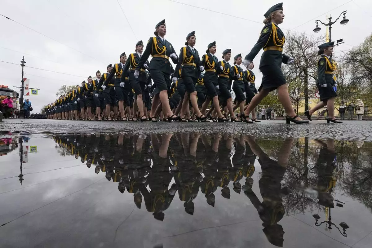 Russian army servicewomen march to attend a rehearsal for the Victory Day military parade at the Dvortsovaya (Palace) Square in St. Petersburg, Russia, Monday, May 5, 2025. (AP Photo/Dmitri Lovetsky)