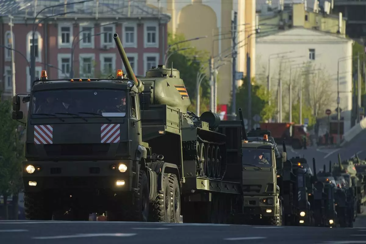 Soviet era T-34 tanks are transported toward Red Square to attend a rehearsal for the Victory Day military parade in Moscow, Russia, on Tuesday, April 29, 2025. (AP Photo/Alexander Zemlianichenko)