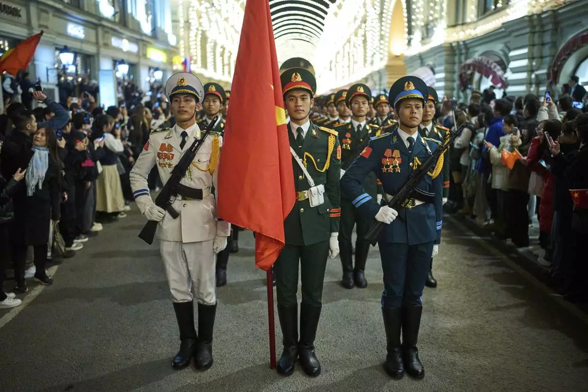 Chinese students greet People's Liberation Army of China soldiers marching along the GUM department store toward Red Square to attend a rehearsal for the Victory Day military parade in Moscow, Russia, on Saturday, May 3, 2025. (AP Photo/Alexander Zemlianichenko)