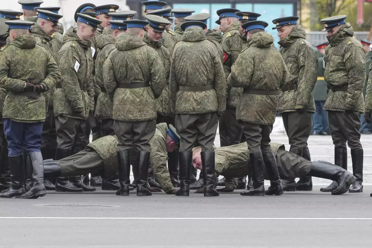 Russian army servicemen compete in push-ups to warm in the cold weather prior to a rehearsal for the Victory Day military parade at the Dvortsovaya (Palace) Square in St. Petersburg, Russia, Monday, May 5, 2025. (AP Photo/Dmitri Lovetsky)