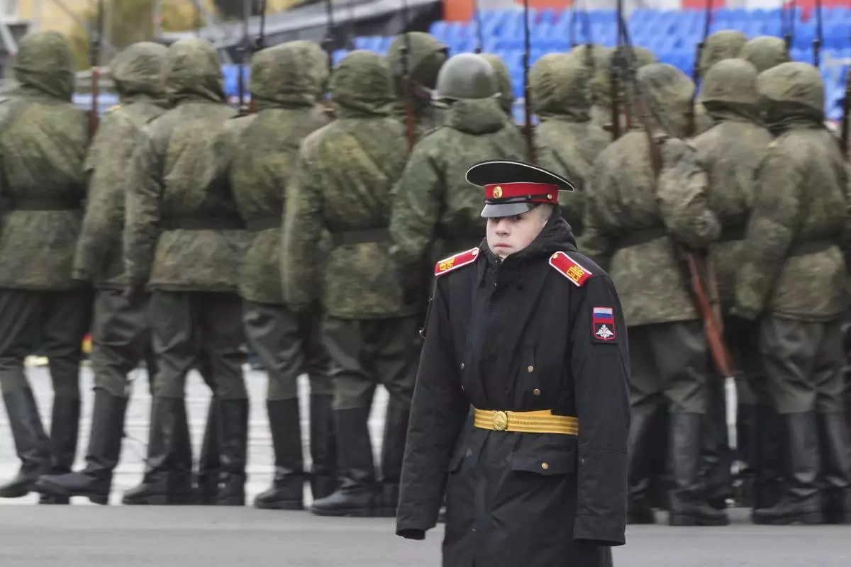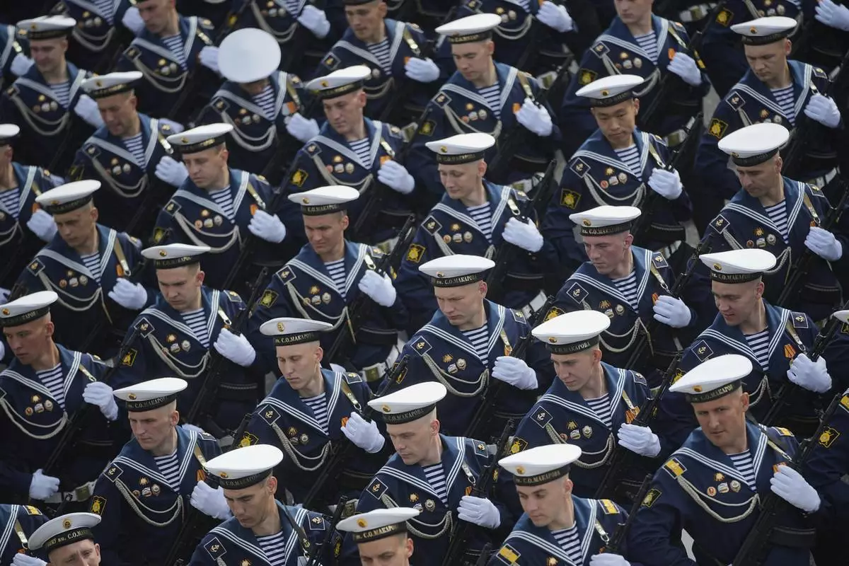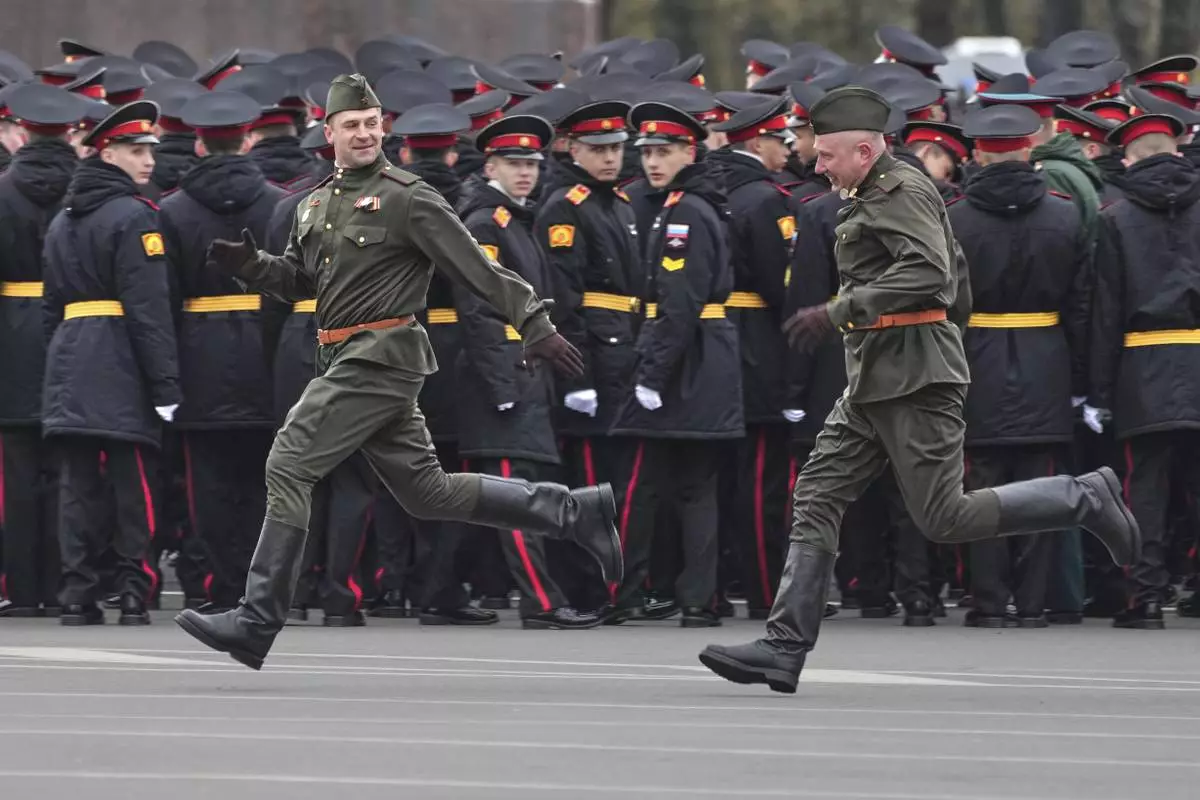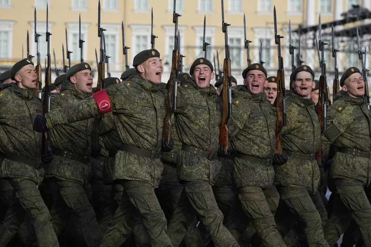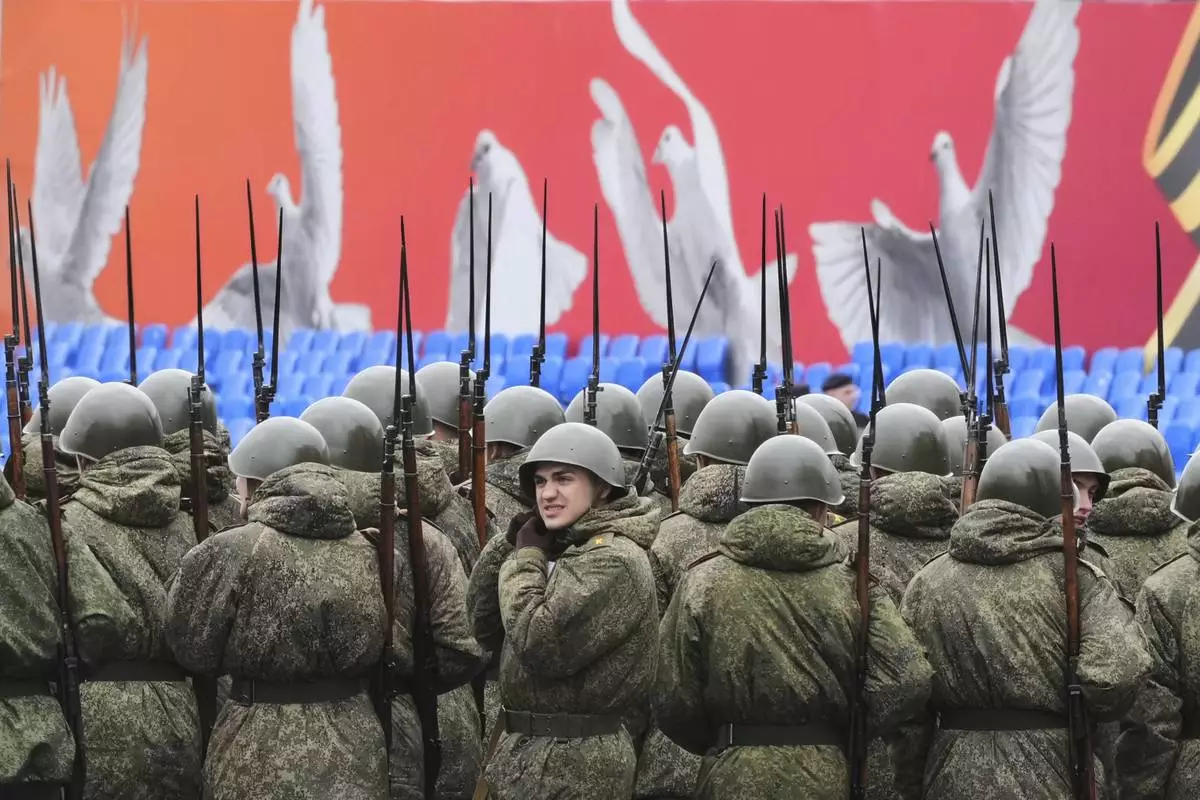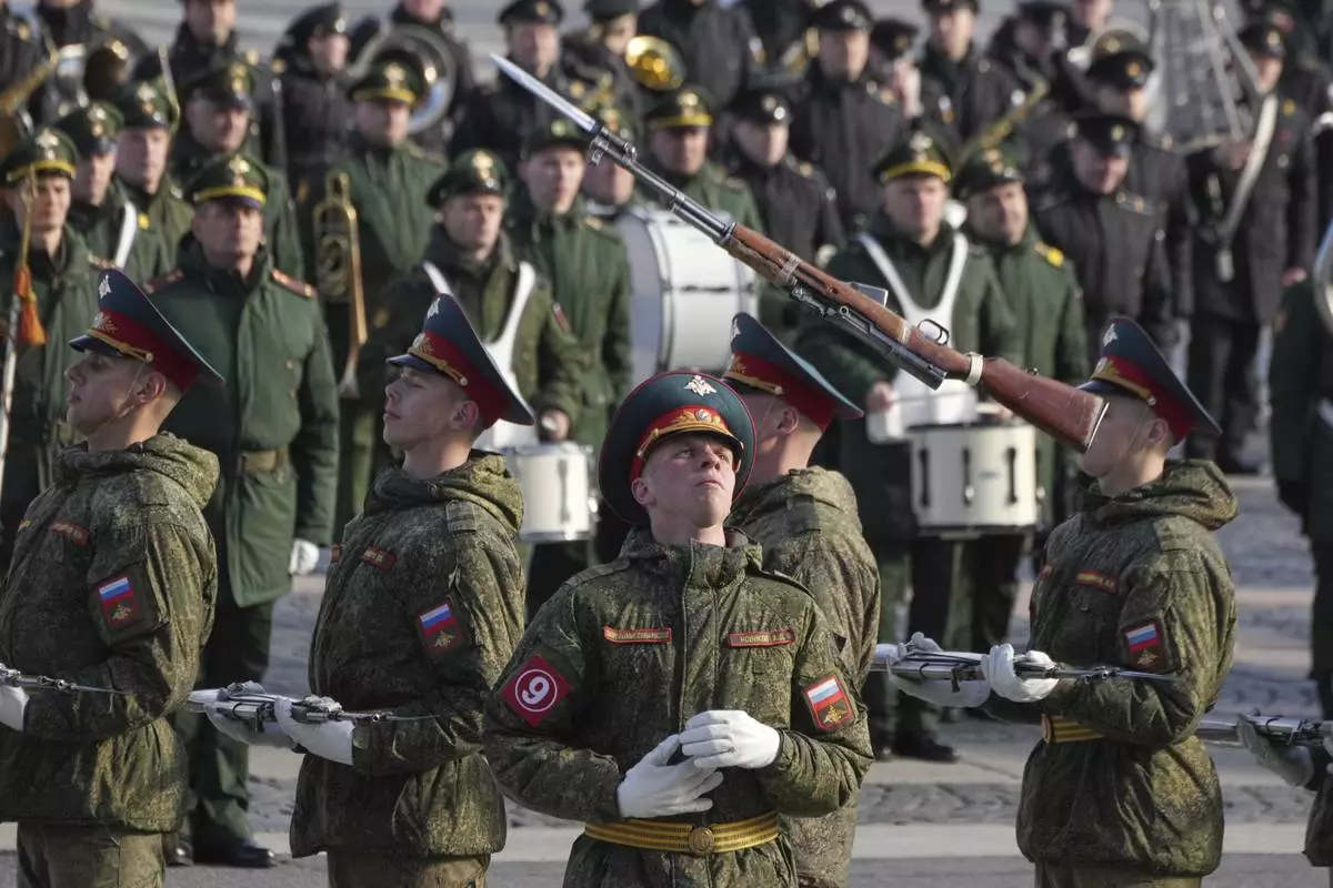 Russian soldiers attend a rehearsal for the Victory Day military parade at the Dvortsovaya (Palace) Square in St. Petersburg, Russia, Wednesday, April 30, 2025. (AP Photo/Dmitri Lovetsky)