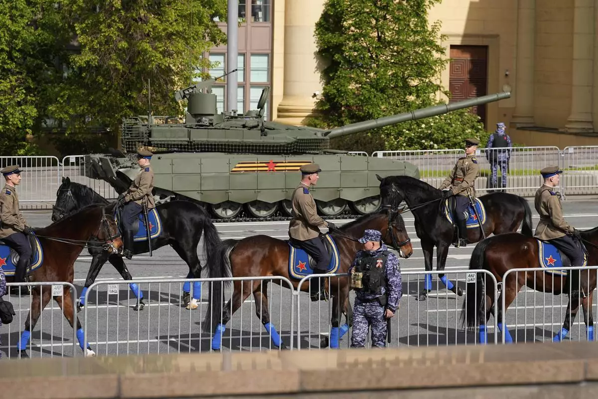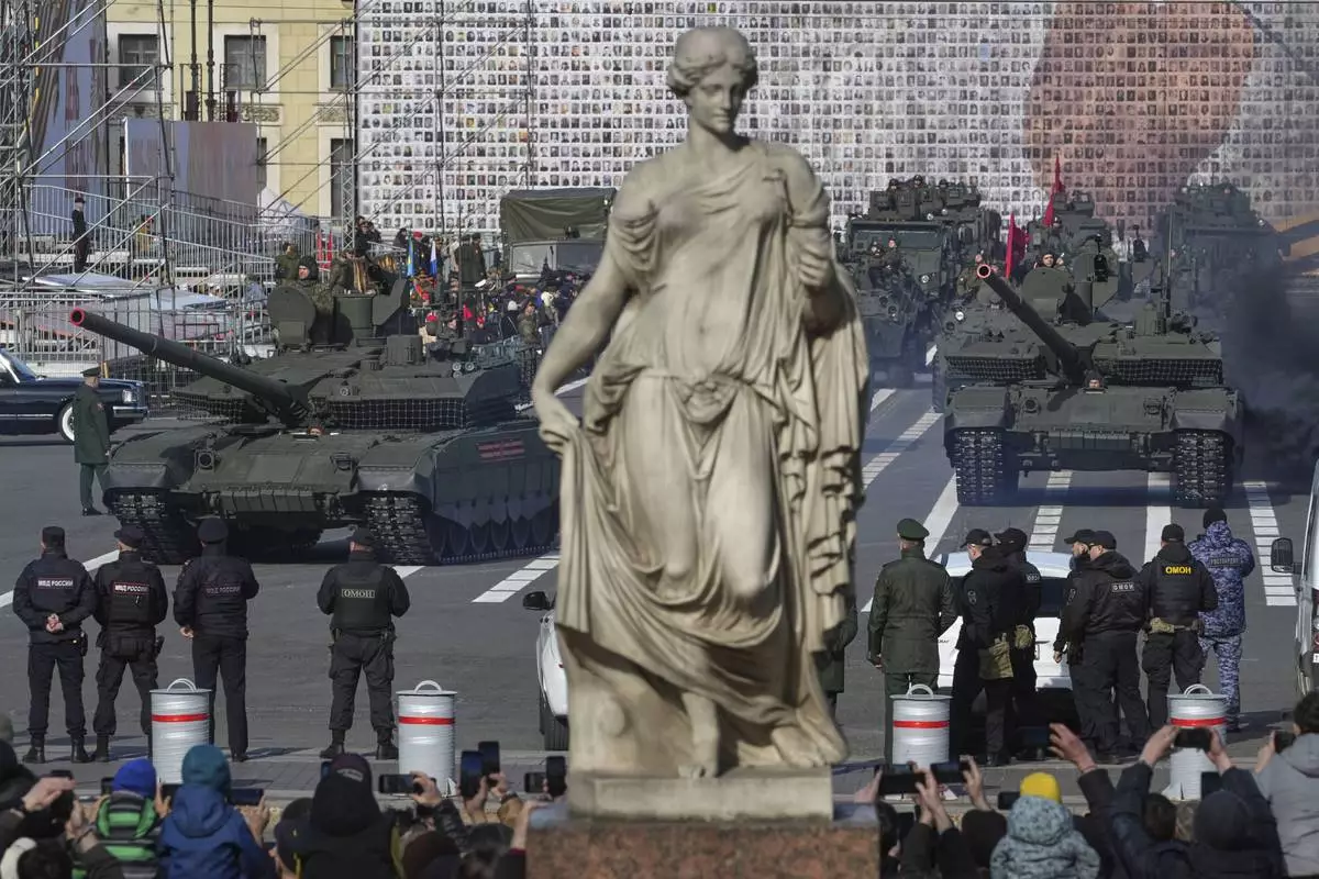 Russian tanks roll during a rehearsal for the Victory Day military parade at the Dvortsovaya (Palace) Square in St. Petersburg, Russia, Saturday, May 3, 2025, with a huge banner with portraits of participants of World War II in the background. (AP Photo/Dmitri Lovetsky)